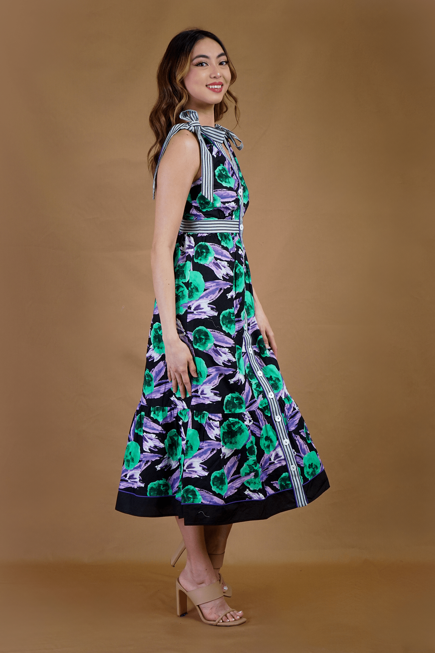 This Black Purple Floral Stripe V Neck Midi Dress is designed with a fitted waist and relaxed fit for a flattering silhouette. The full button-down front and tied shoulder straps add a classic touch, while the stripe print contrast adds a stylish element. Perfect for any occasion, this dress combines comfort and elegance. 100% Cotton