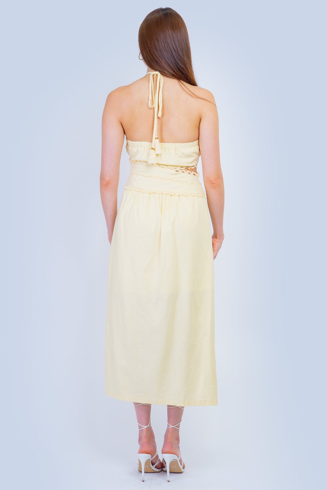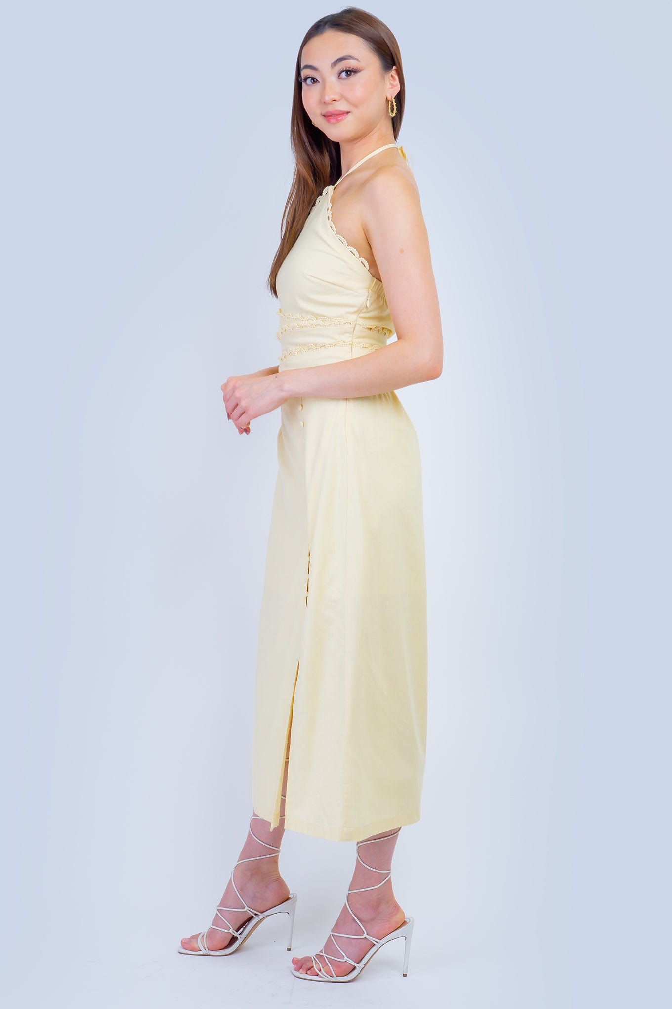 This Butter Scallop Trim Halter Dress offers practical elegance in a soft yellow shade. The high neck halter design provides secure coverage, while the asymmetrical ric rac lace detail at the waist adds visual interest with a functional side cut out. The midi-length skirt includes a practical front side slit for ease of movement, and the side zipper ensures straightforward dressing and a reliable fit.