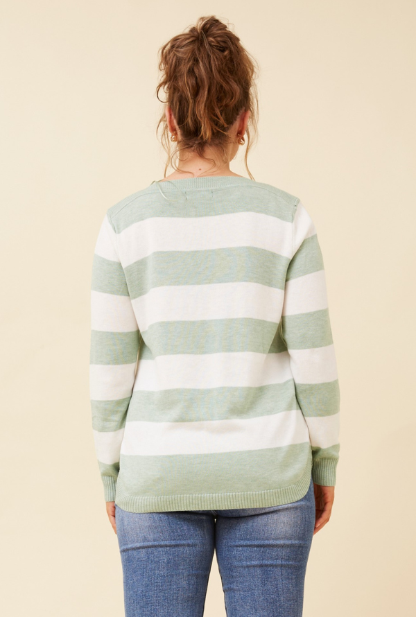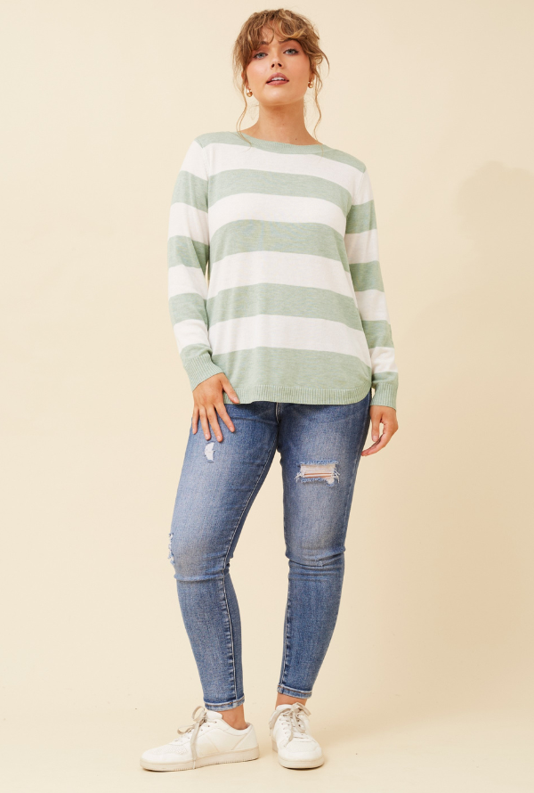 The Sasha Knit showcases bold light green stripes across a lightweight, breathable knit—designed to transition seamlessly through the seasons. Wear solo or layer it effortlessly from Autumn through to Winter.