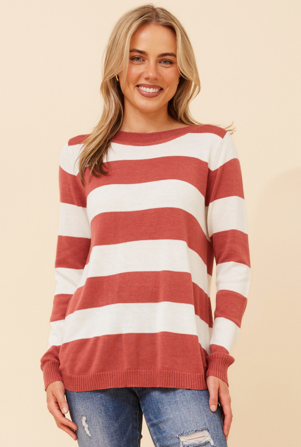 The Sasha Knit showcases bold rust stripes across a lightweight, breathable knit—designed to transition seamlessly through the seasons. Wear solo or layer it effortlessly from Autumn through to Winter.
