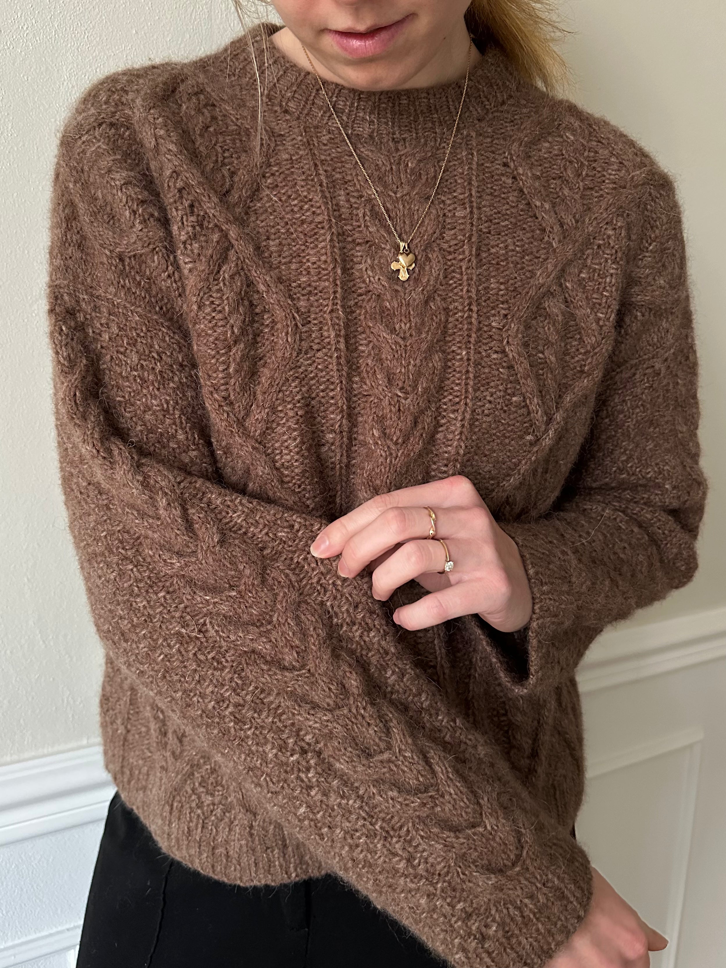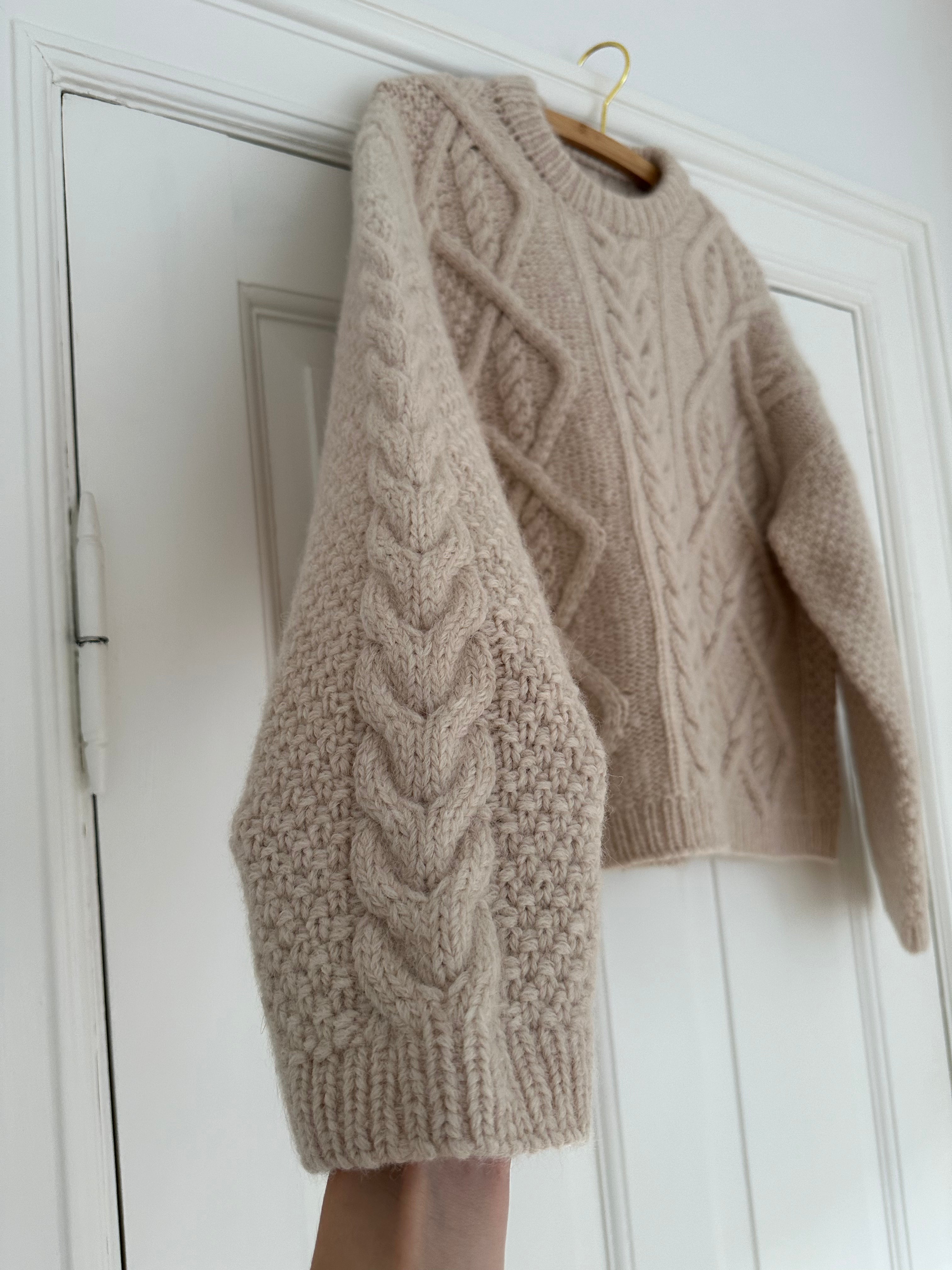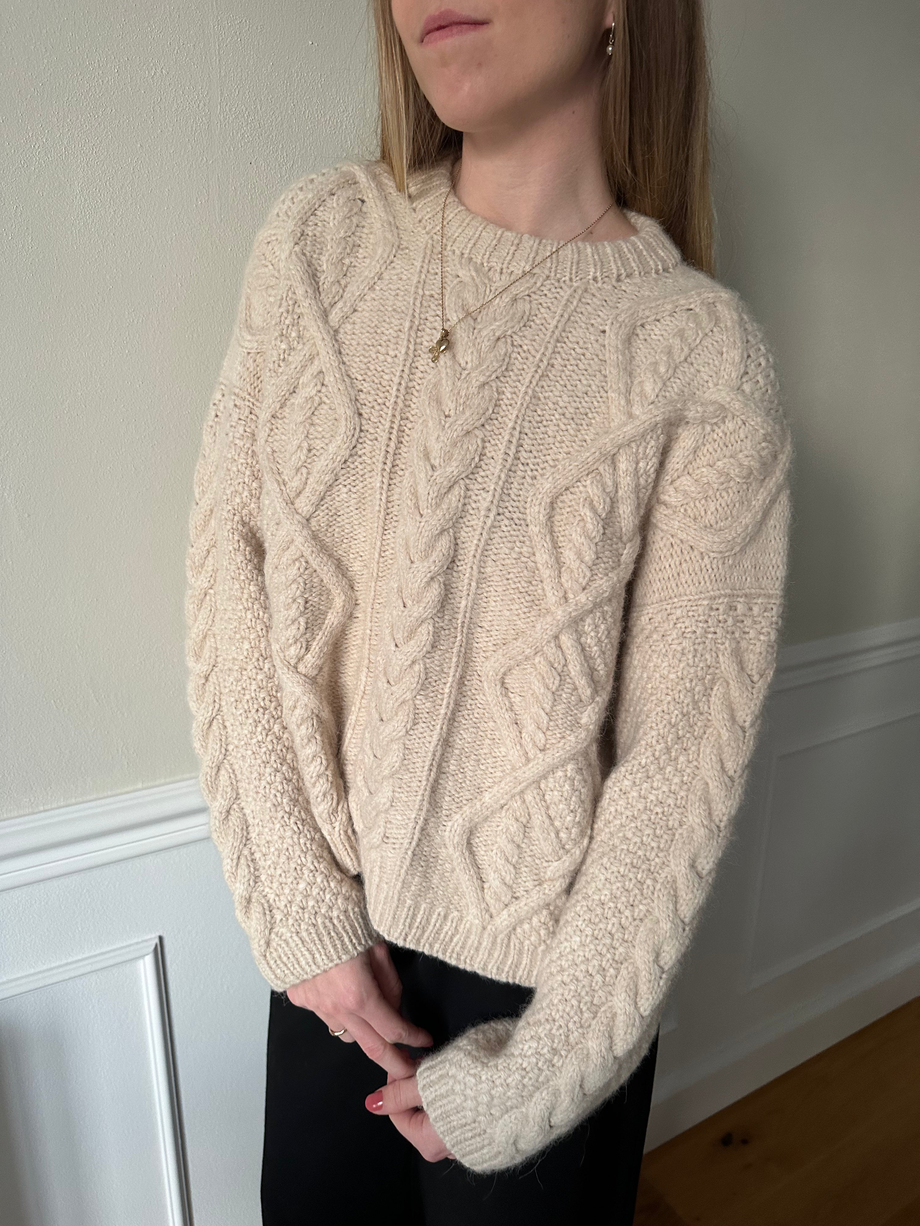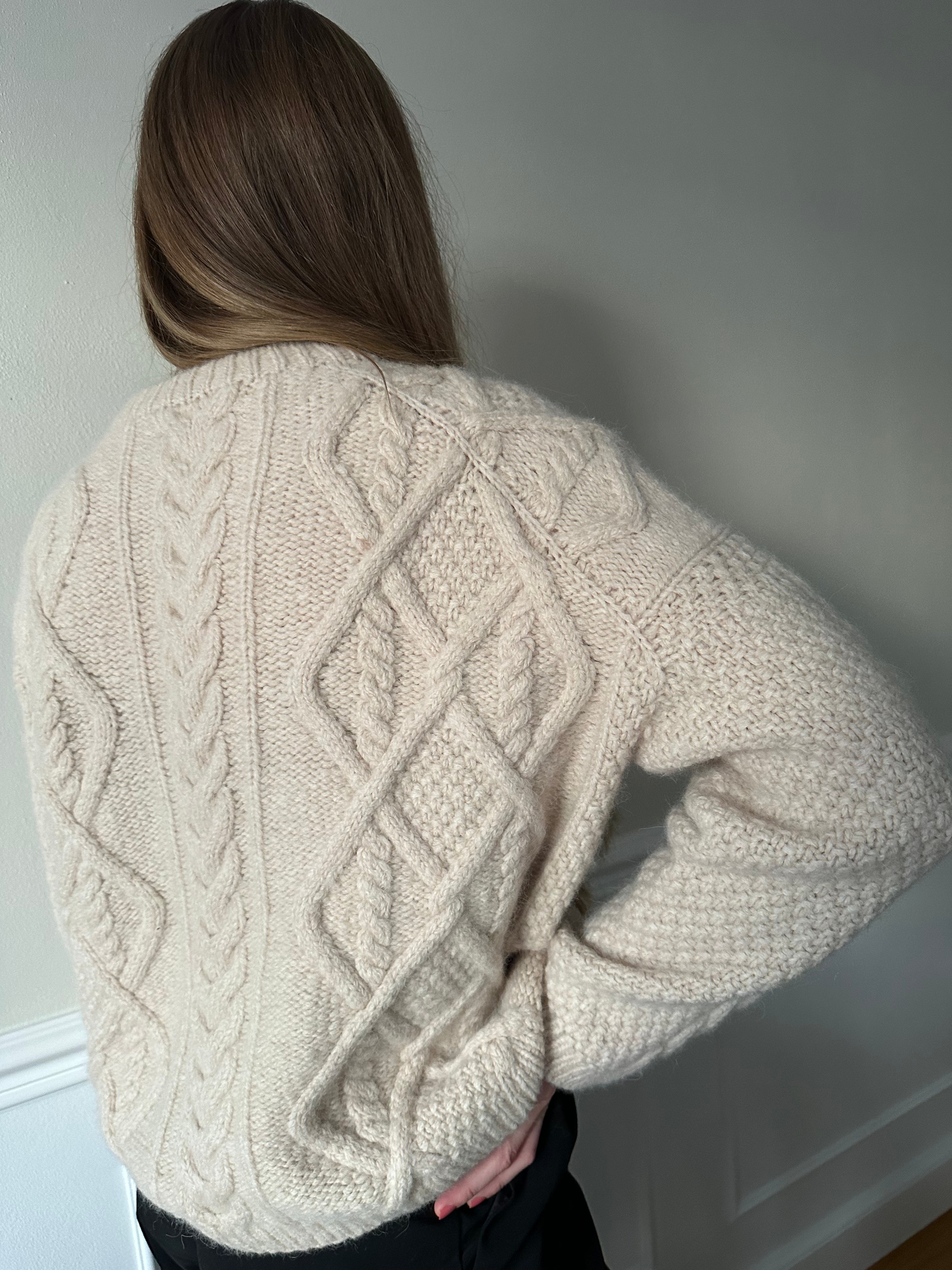 Sweateren strikkes oppefra og ned. Der slås først masker op til rygstykket, som strikkes frem og tilbage mens der laves udtagninger. Der samles herefter masker op til venstre og derefter højre skulderstykke, der strikkes med vendepinde og udtagninger for at skabe halsåbningen. Skulderstykkerne samles til ét forstykke, der strikkes frem og tilbage, indtil det samles med rygstykket og kroppen er skabt. Kroppen strikkes rundt på pinden og afsluttes med en ribkant og italiensk aflukning. Der samles masker op til halskanten, der strikkes i rib og foldes til en dobbelt halskant. Afslutningsvist strikkes ærmerne. Der samles masker op i ærmegabene, strikkes rundt mens der laves indtagninger og afsluttes med ribkant og italiensk aflukning.