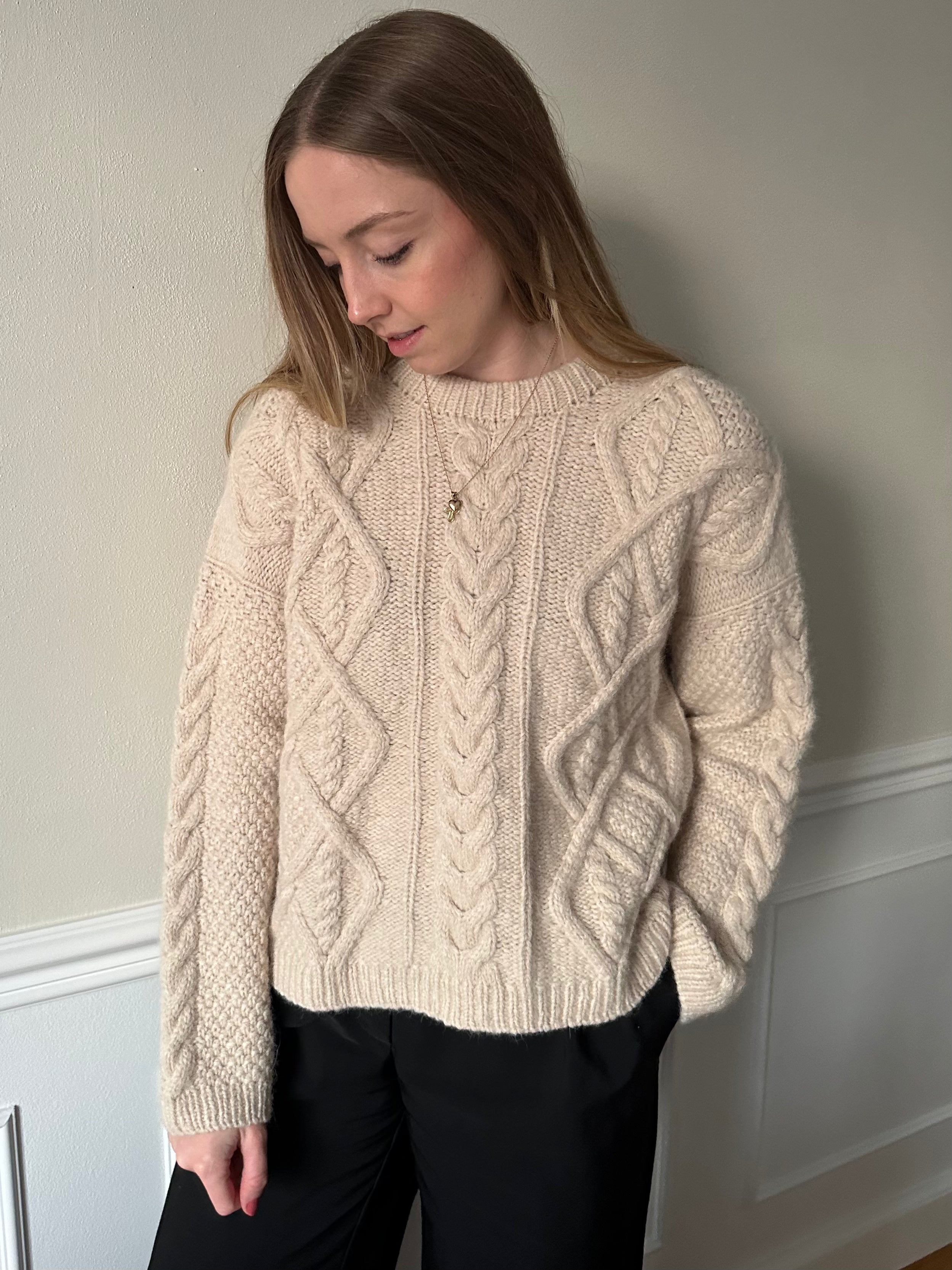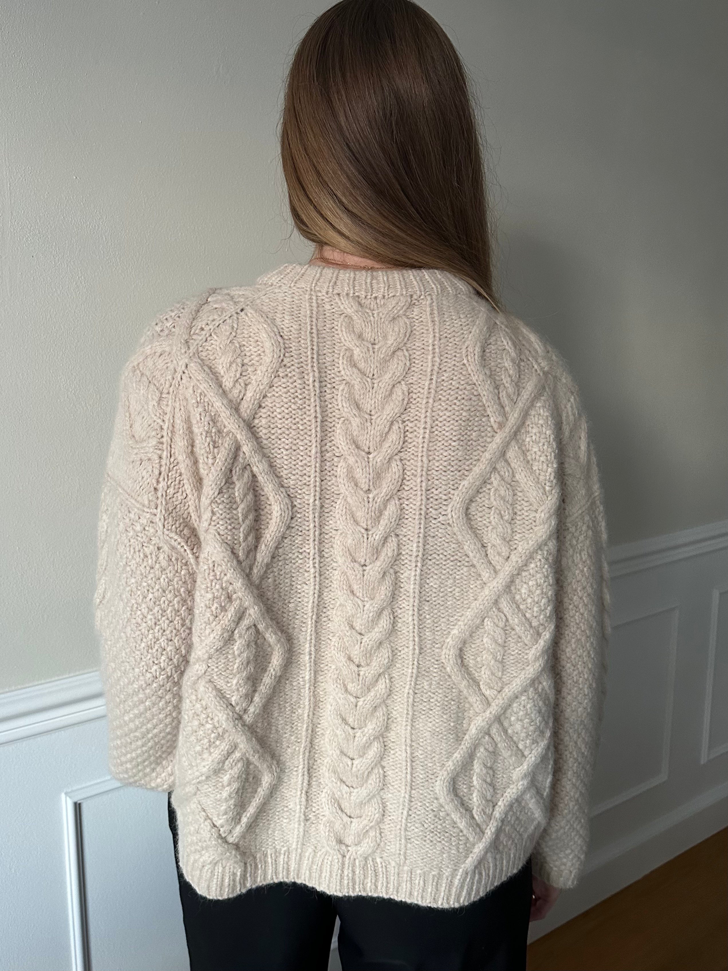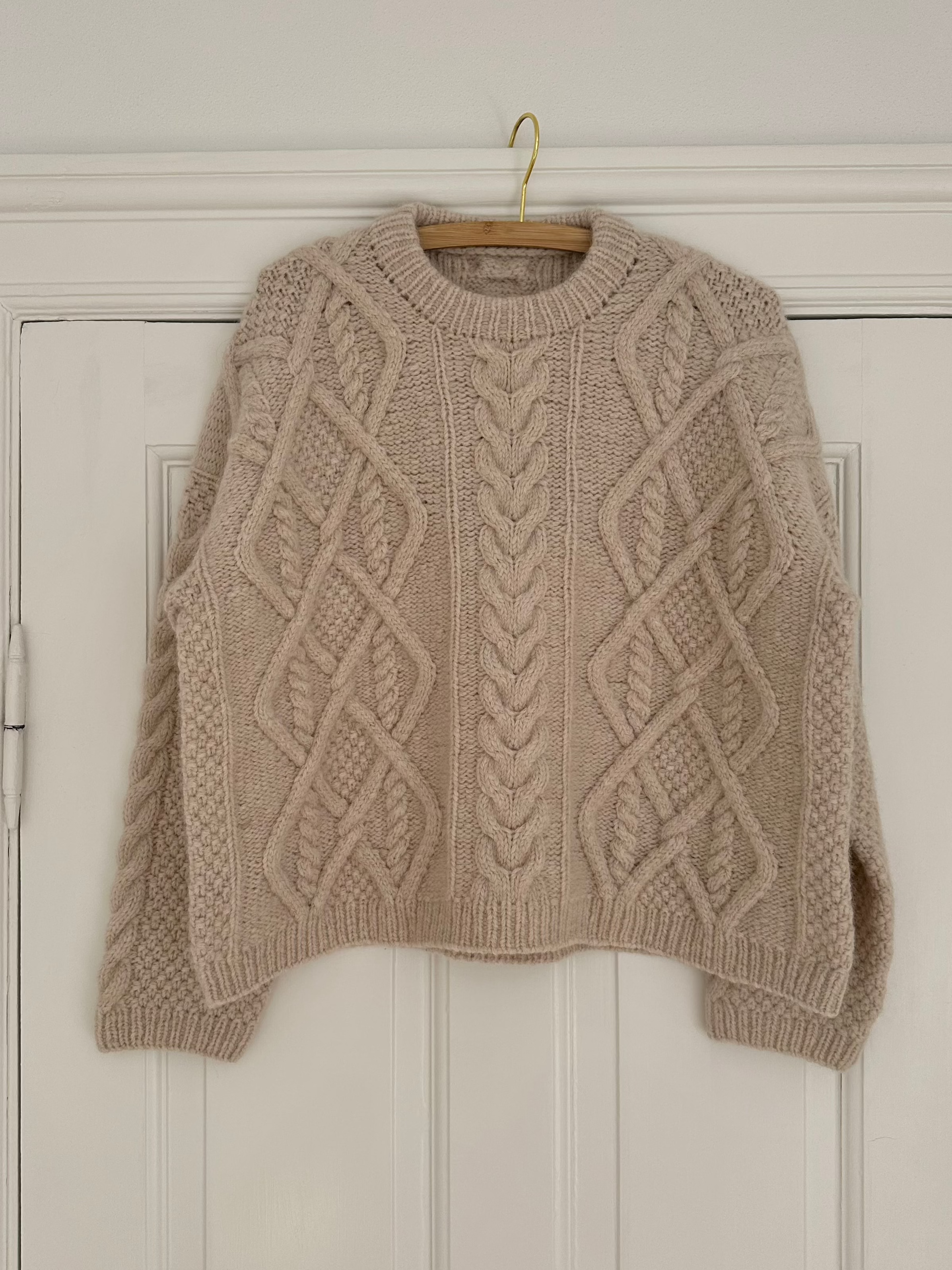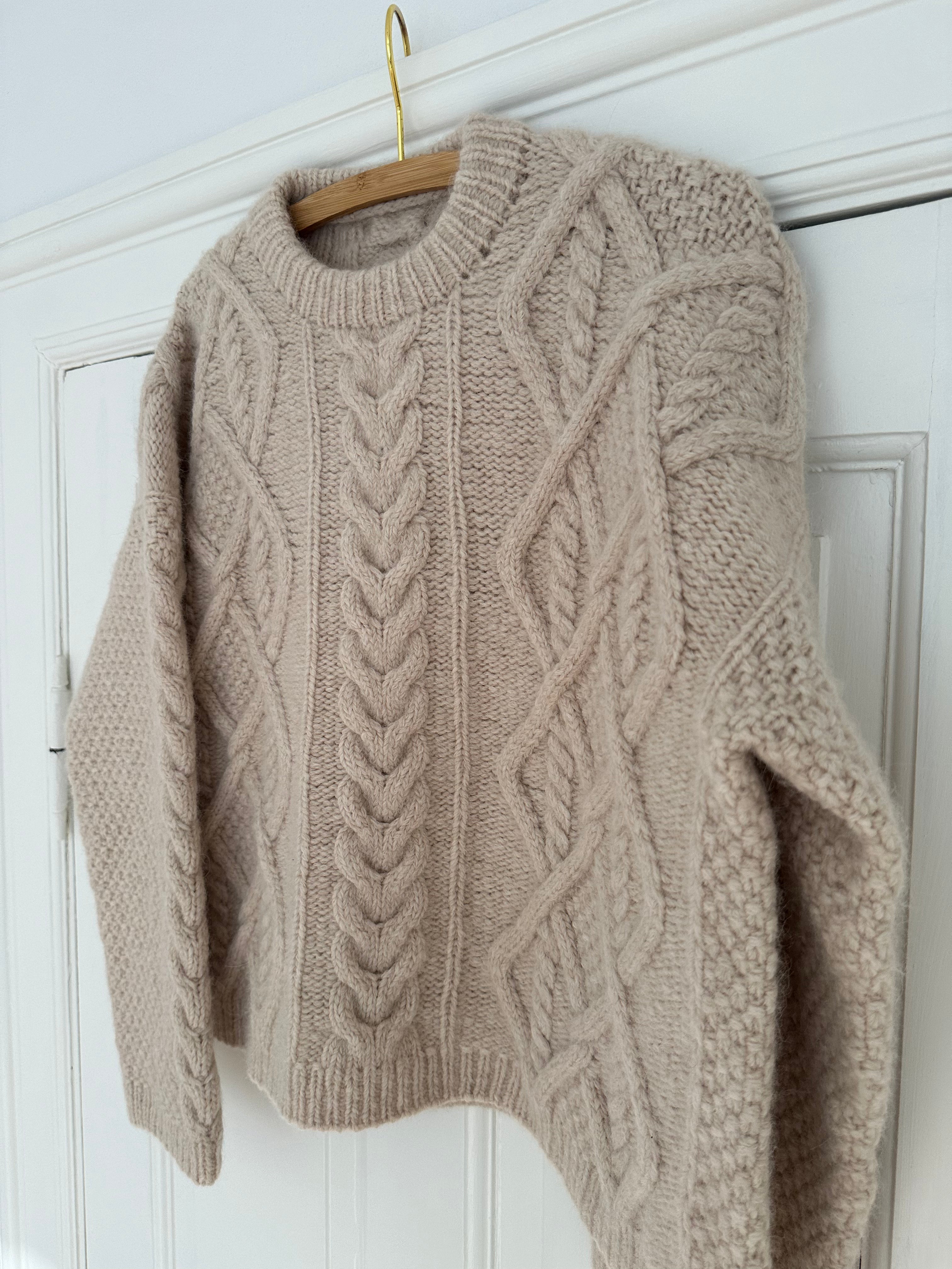 Sweateren strikkes oppefra og ned. Der slås først masker op til rygstykket, som strikkes frem og tilbage mens der laves udtagninger. Der samles herefter masker op til venstre og derefter højre skulderstykke, der strikkes med vendepinde og udtagninger for at skabe halsåbningen. Skulderstykkerne samles til ét forstykke, der strikkes frem og tilbage, indtil det samles med rygstykket og kroppen er skabt. Kroppen strikkes rundt på pinden og afsluttes med en ribkant og italiensk aflukning. Der samles masker op til halskanten, der strikkes i rib og foldes til en dobbelt halskant. Afslutningsvist strikkes ærmerne. Der samles masker op i ærmegabene, strikkes rundt mens der laves indtagninger og afsluttes med ribkant og italiensk aflukning.