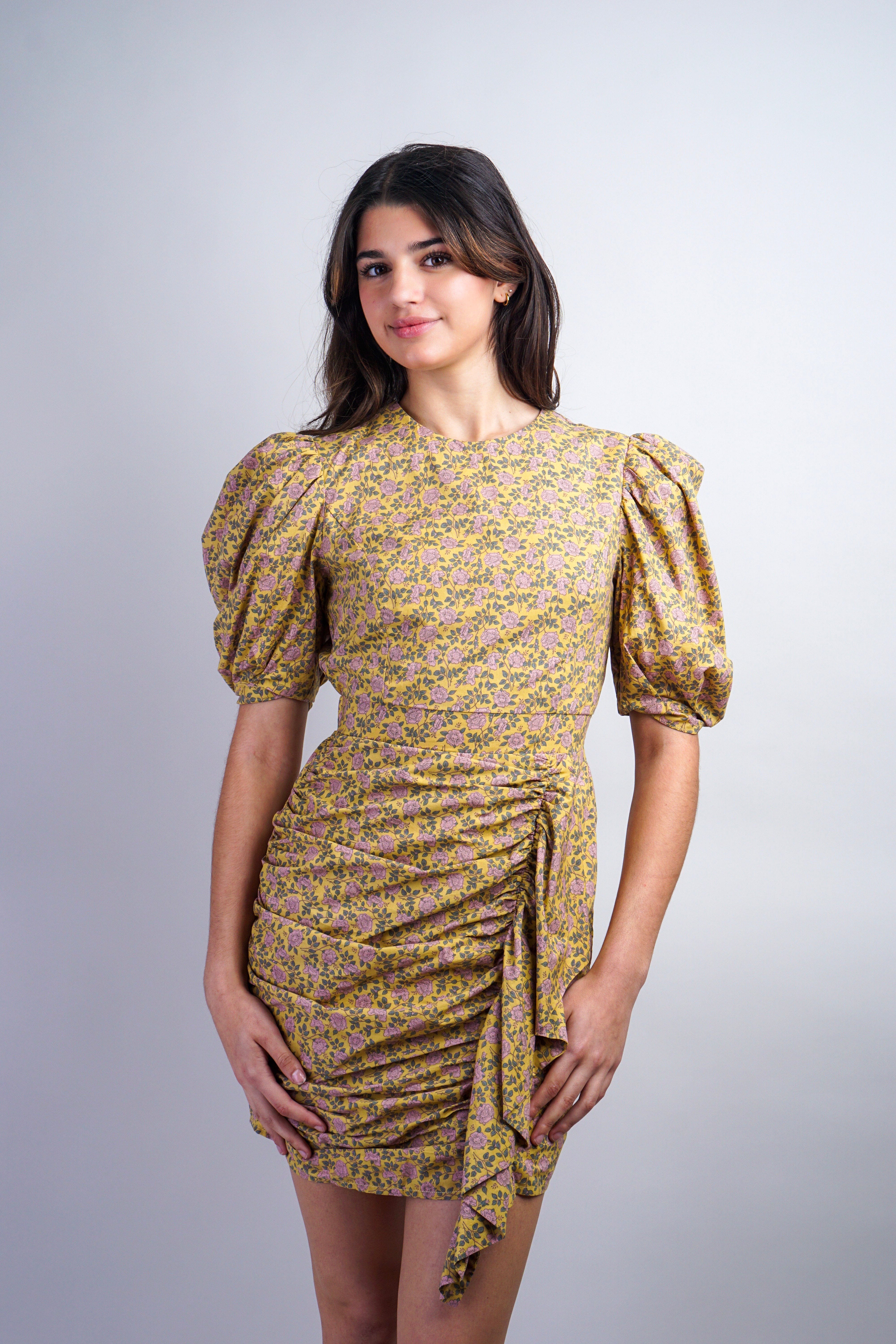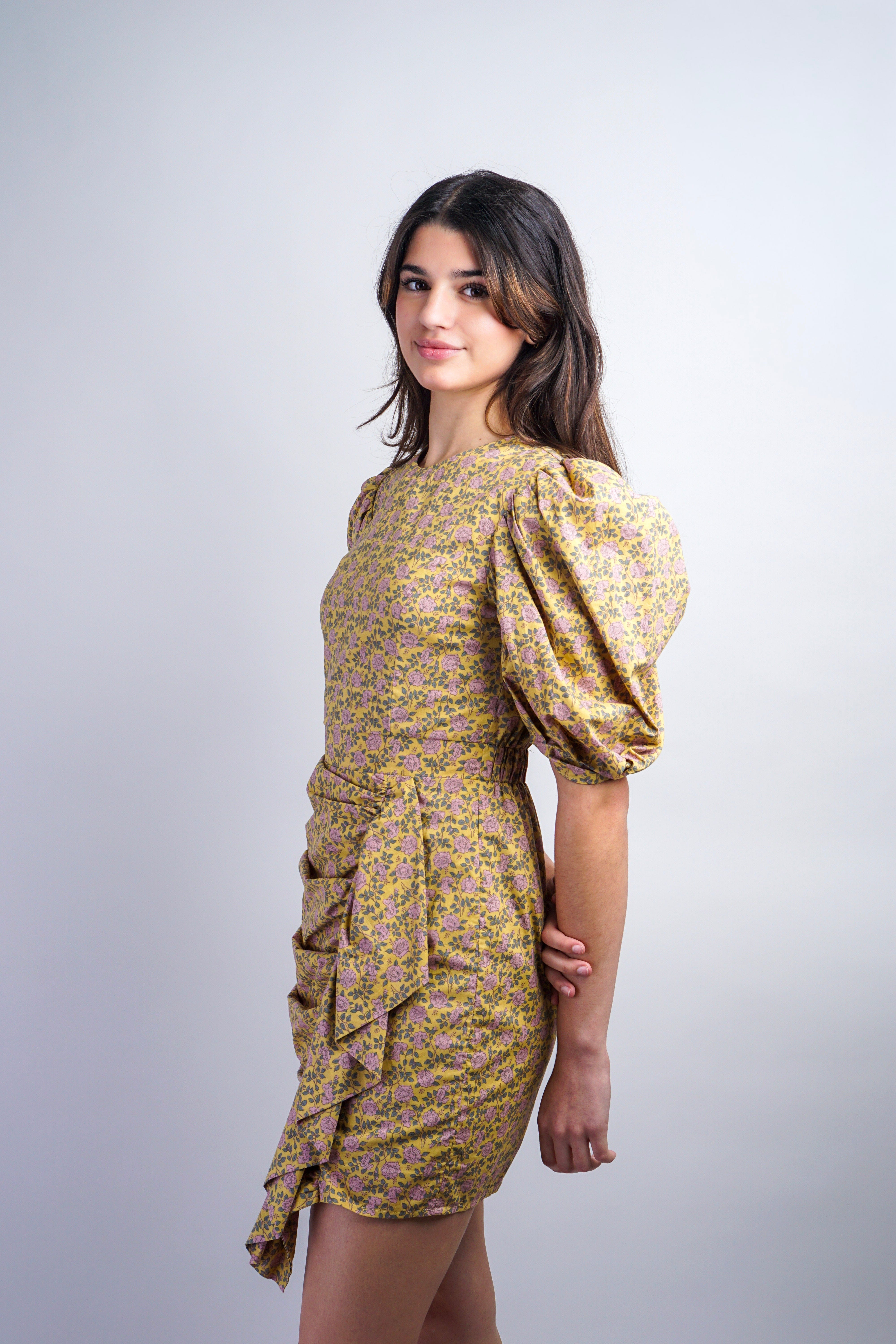 Mustard Flowers Side Drape Dress