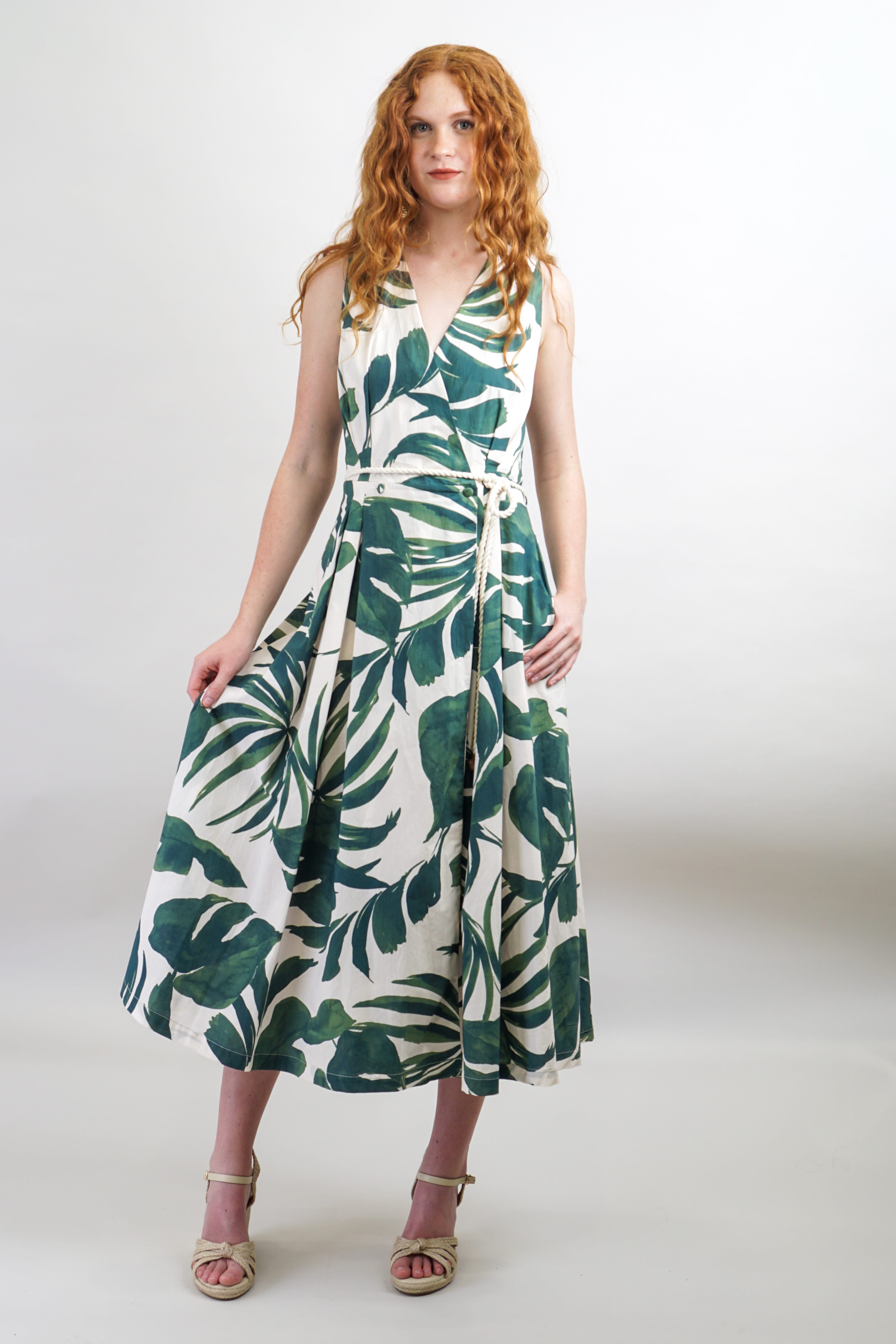 Green Ivory Flower Vine Dress with Cord