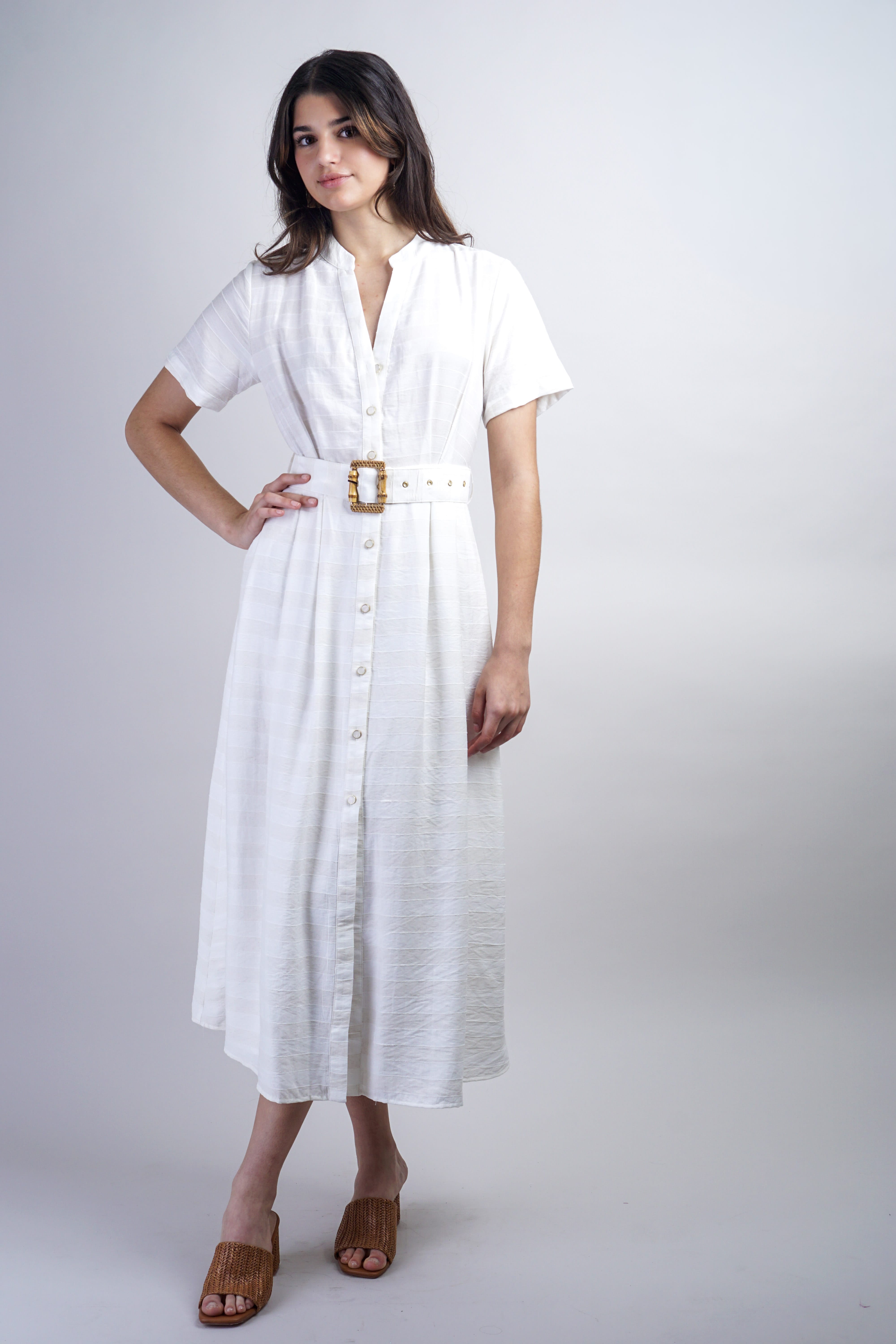 Ivory Striped Belted Shirt Dress