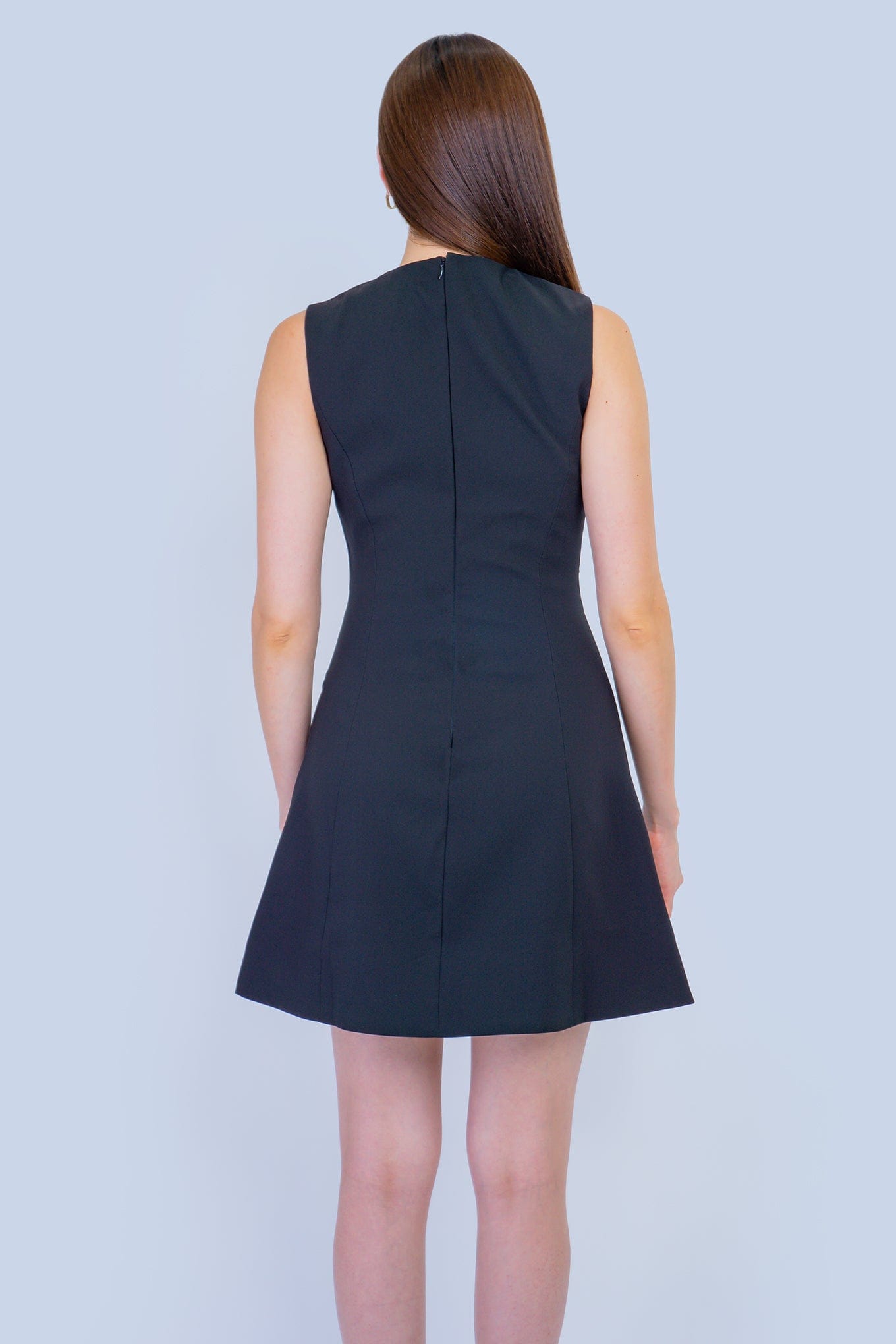 This Black Fit and Flare Dress offers functional design with practical details. The sleeveless scoop neck provides comfortable wear in various settings, while the short fit and flare shape allows for easy movement. Gold bow buttons add a refined touch to the asymmetrical front, which includes a practical slit for walking ease. The faux right pocket maintains a clean look without added bulk, and the center back zipper ensures no-fuss dressing.