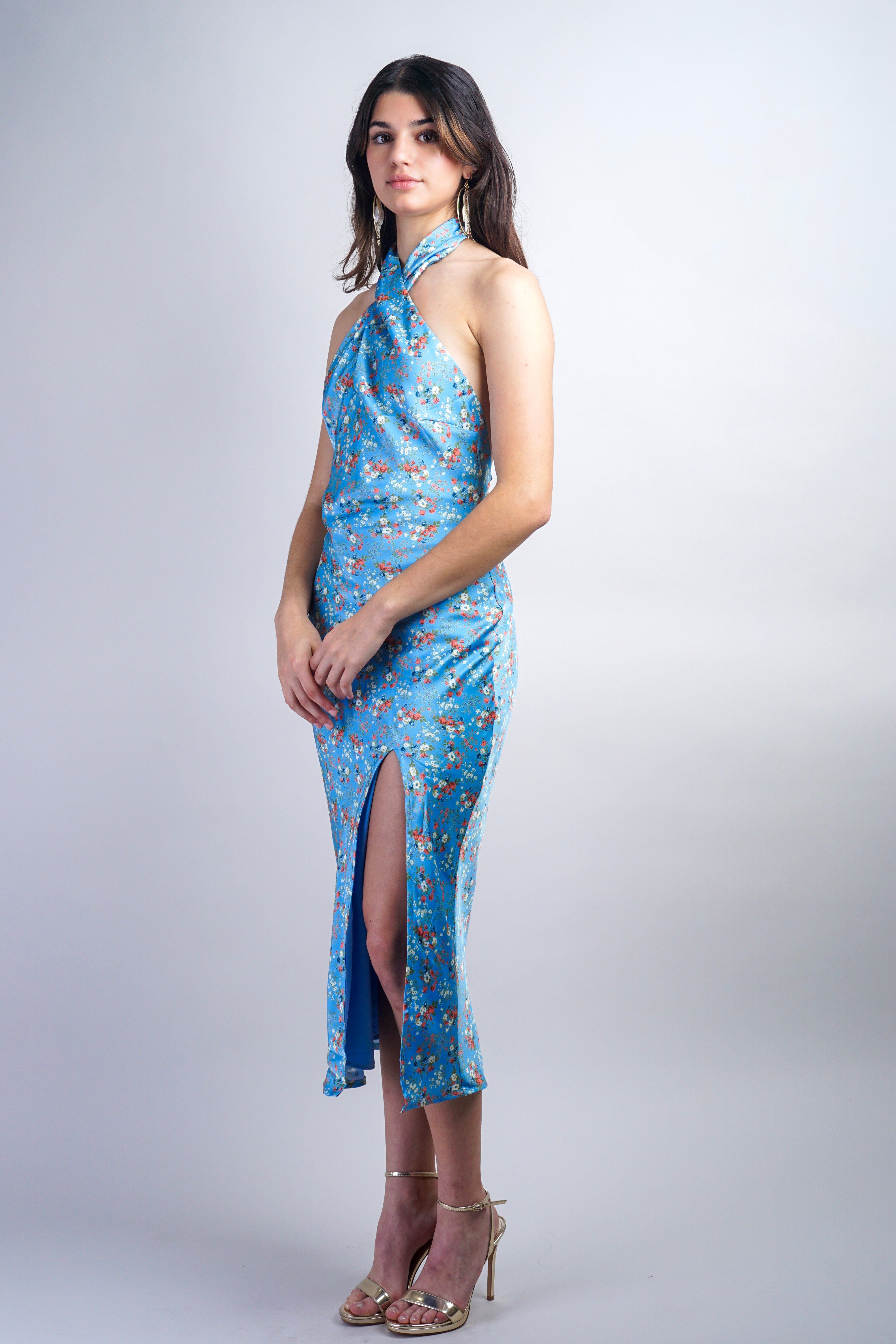 Elegant midi dress in a soft blue hue, adorned with delicate petite floral details. Features a flattering twist halter neckline that creates a refined silhouette. Crafted from 100% polyester for easy care and comfortable wear. Perfect for garden parties, brunch, or special occasions where understated sophistication is desired. The midi length offers timeless appeal and versatile styling options.