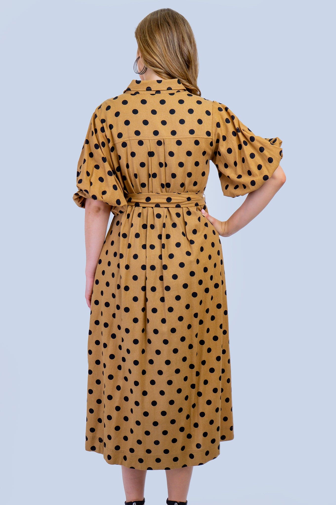 This Mocha Black Polka Dot Dress features a high collar and a button-down design with puffy lantern sleeves. The relaxed fit is complemented by a matching belt to complete the look.