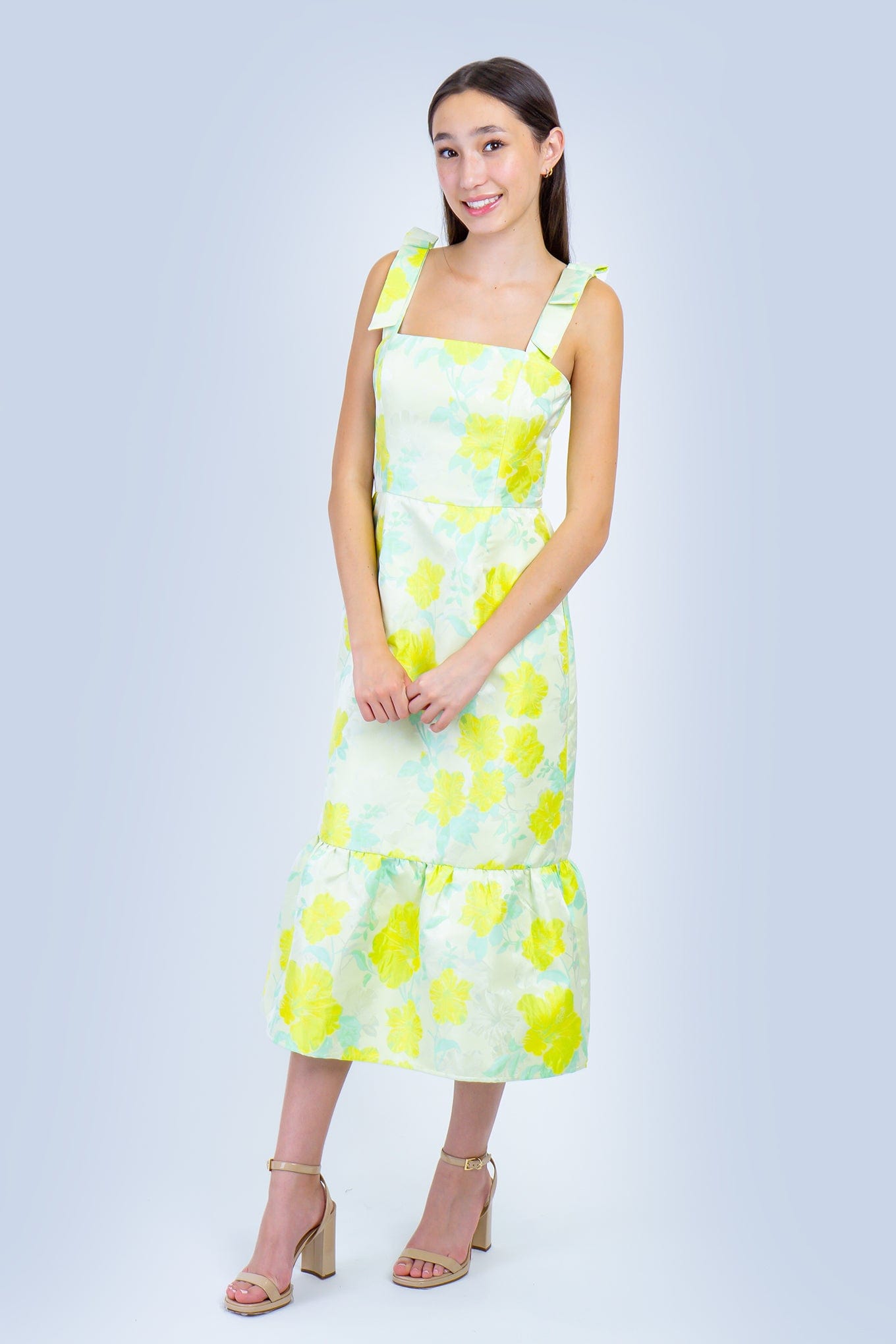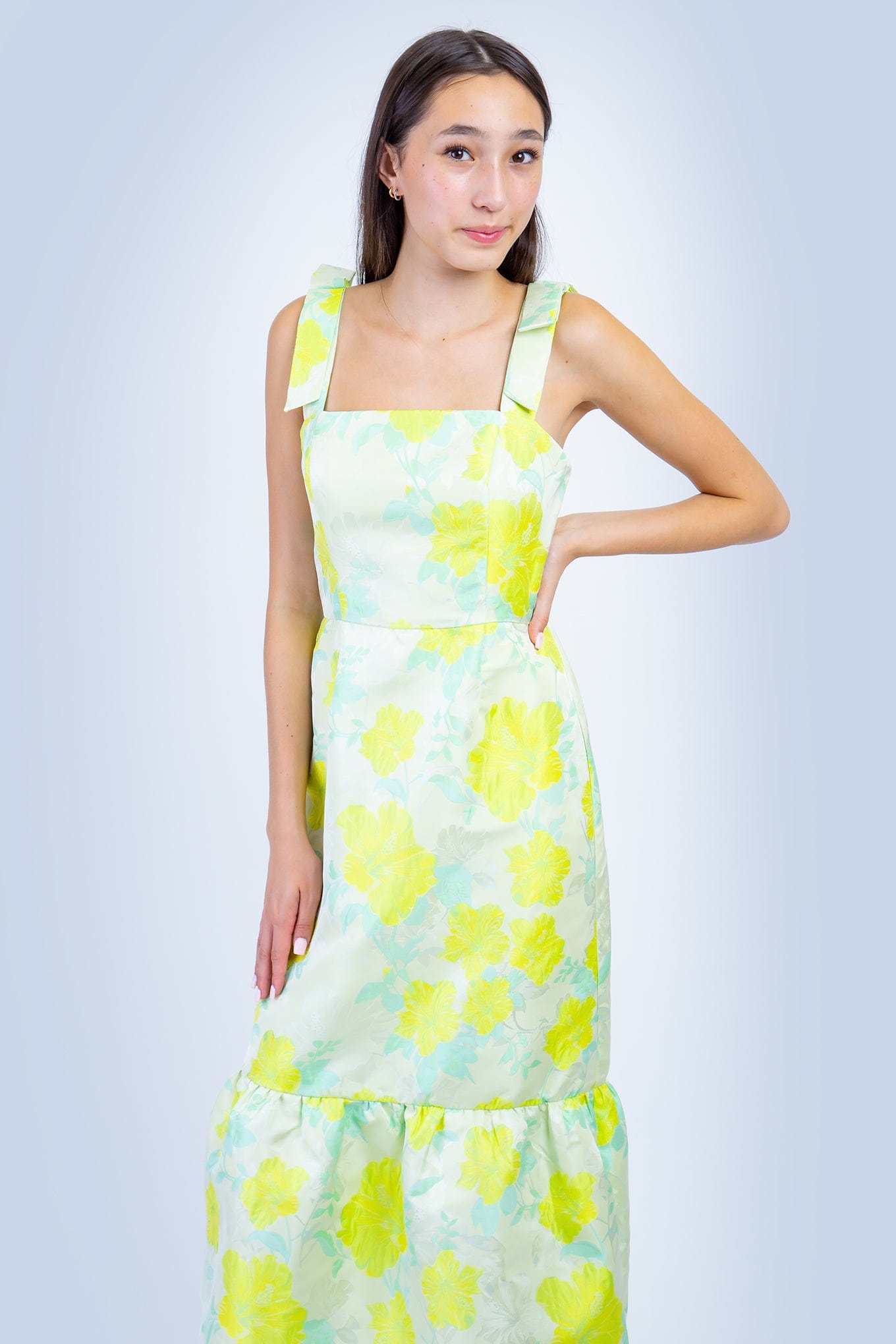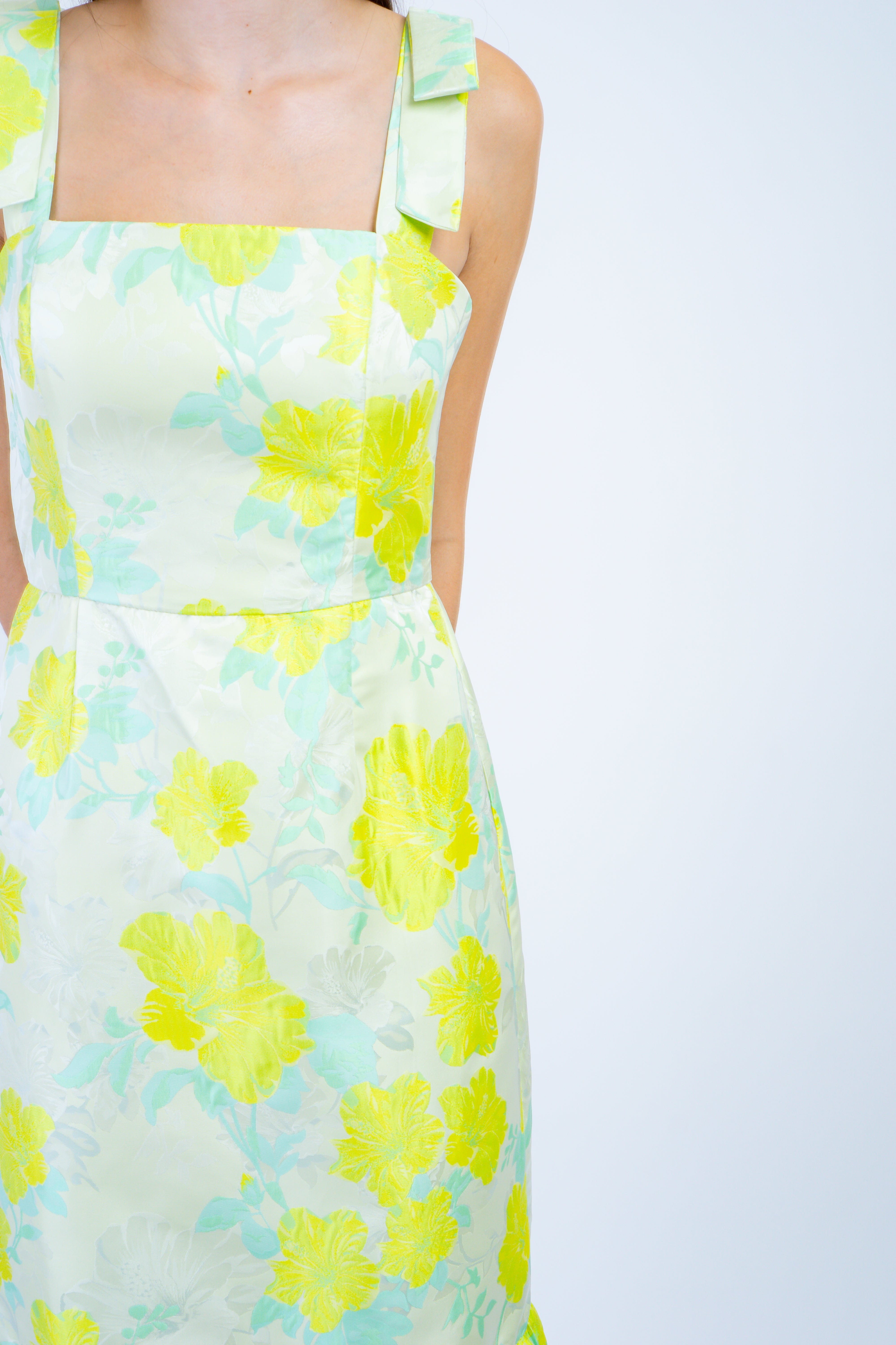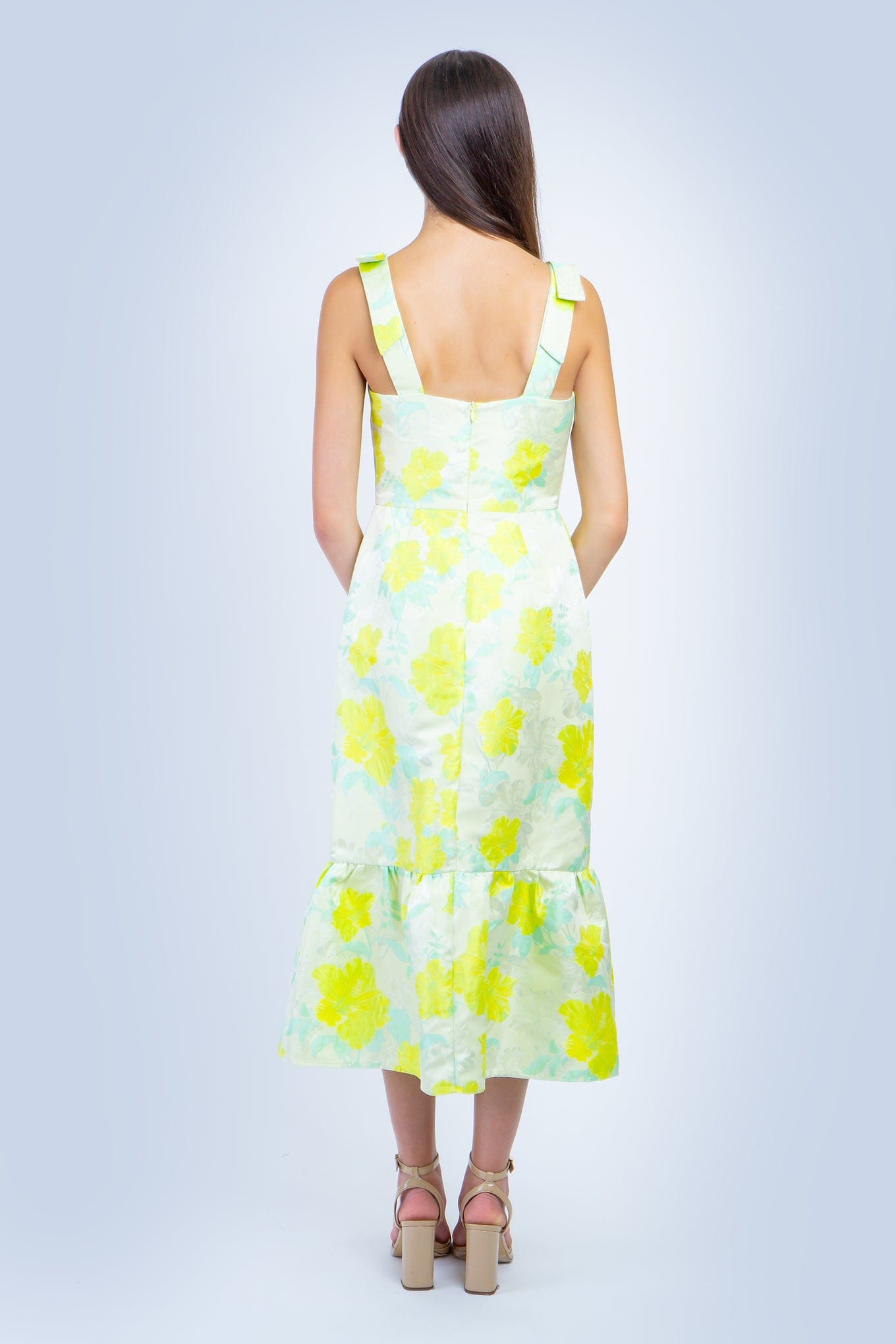 Vibrant Neon Yellow Midi Dress adorned with mint floral patterns. Features an elegant square neckline and substantial straps with decorative bows. The sophisticated fitted silhouette transitions into a graceful ruffle hem. Convenient center back zipper closure for effortless wear.