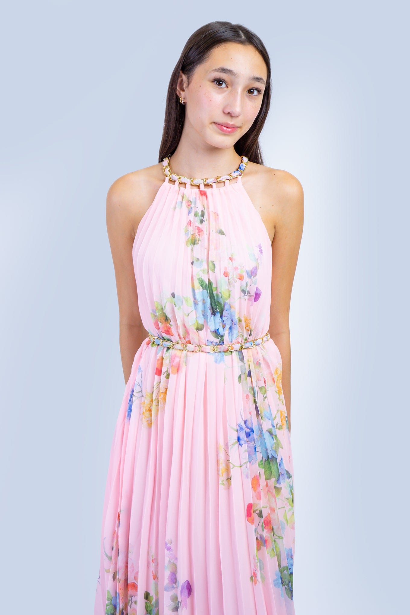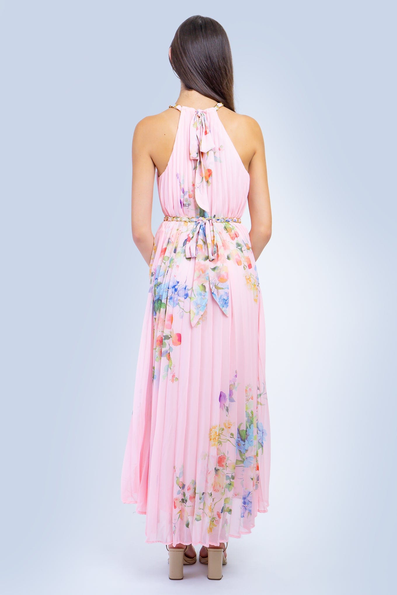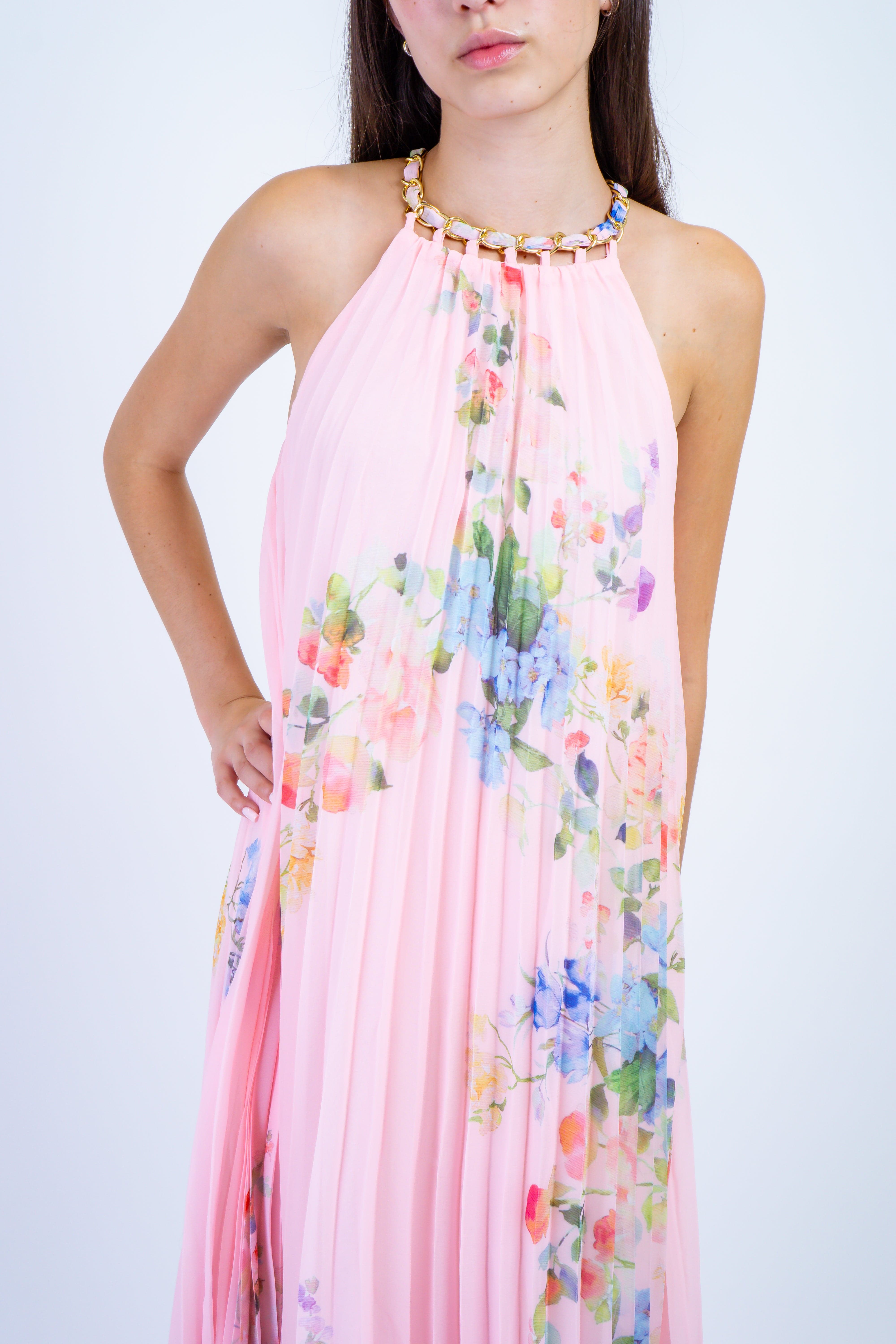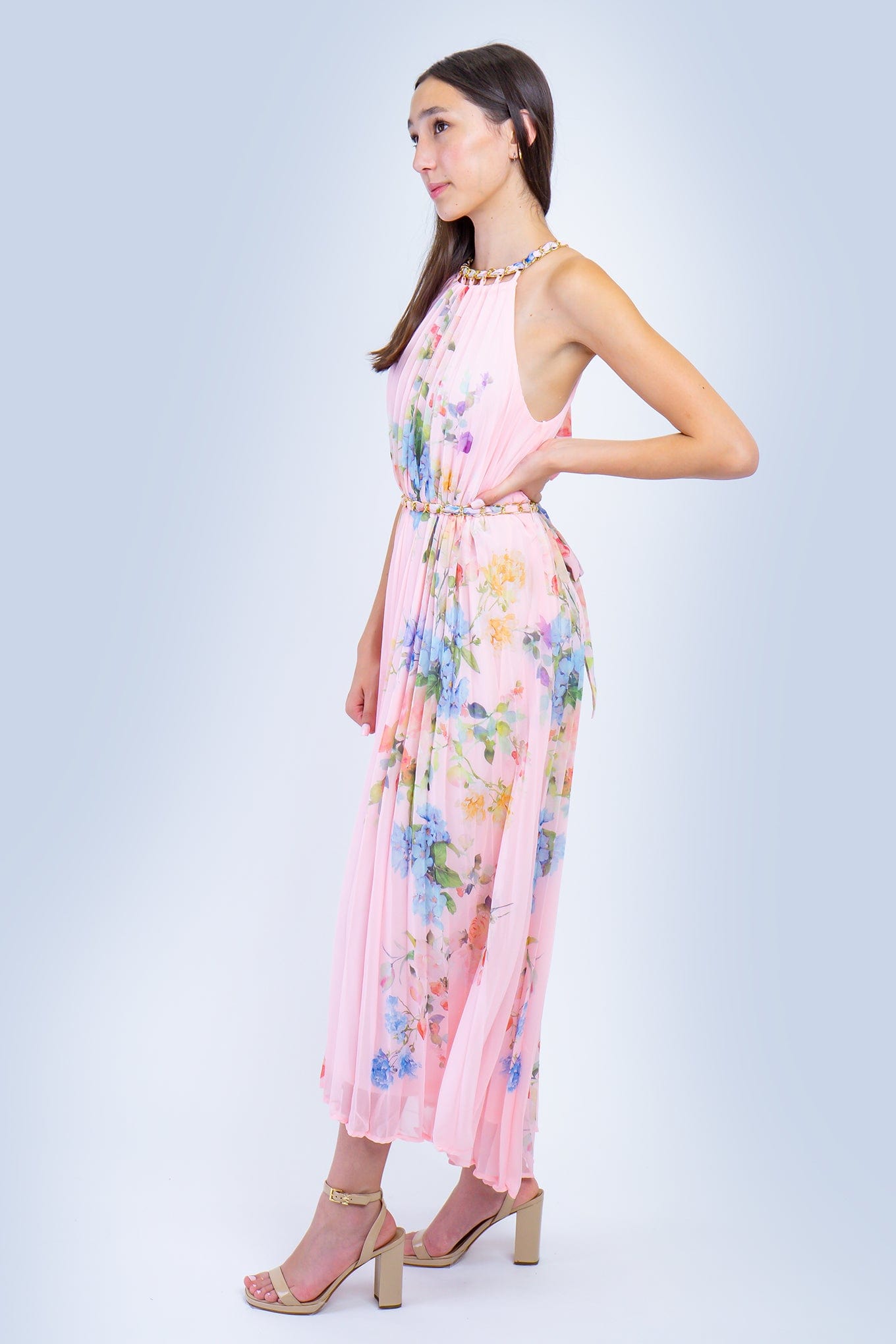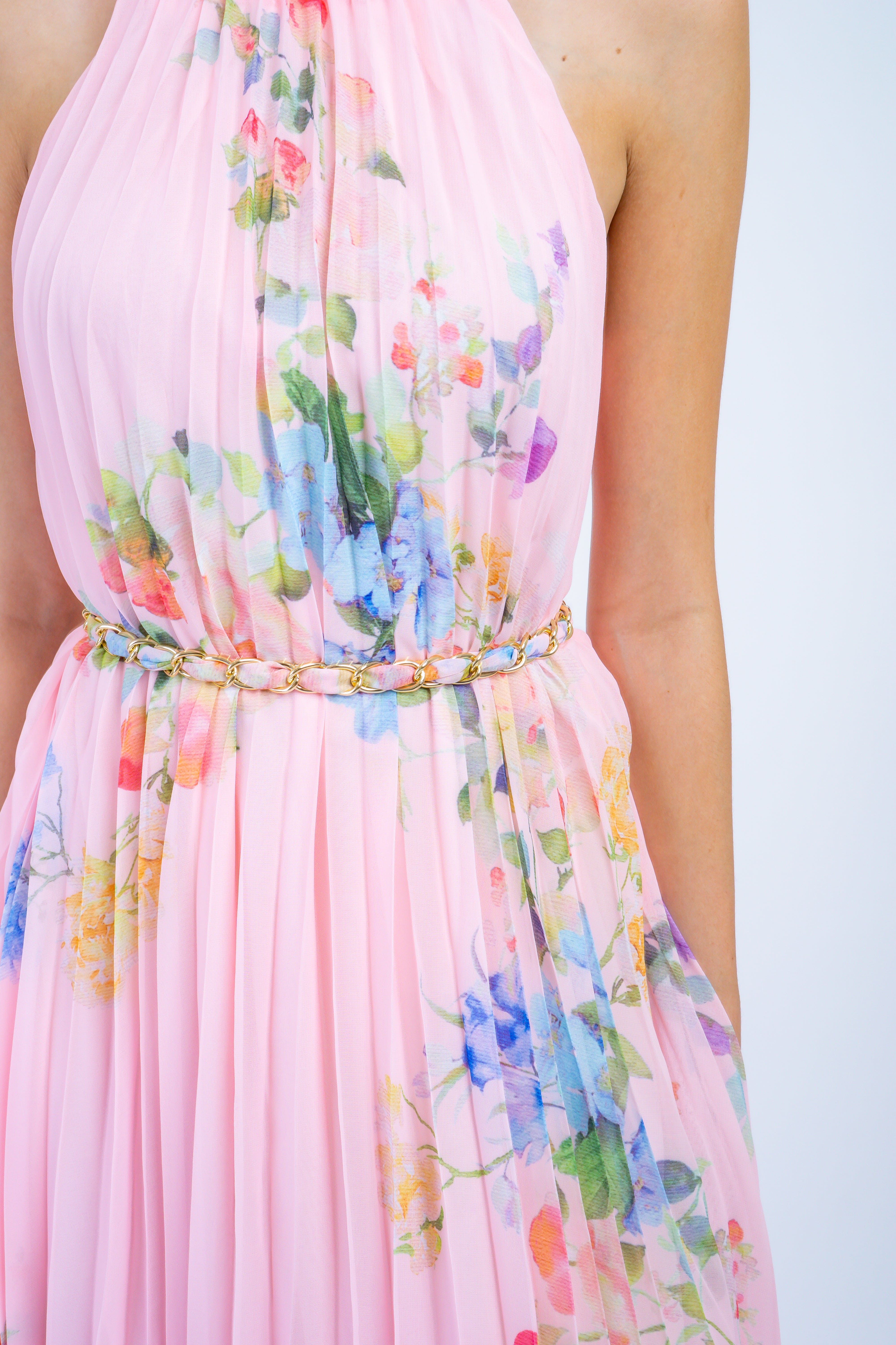 This pink floral dress features a sleeveless halter design with a delicate chain detail. Its relaxed fit and midi-length pleated skirt offer effortless elegance, while the matching chain belt allows you to define your waist for a refined silhouette.