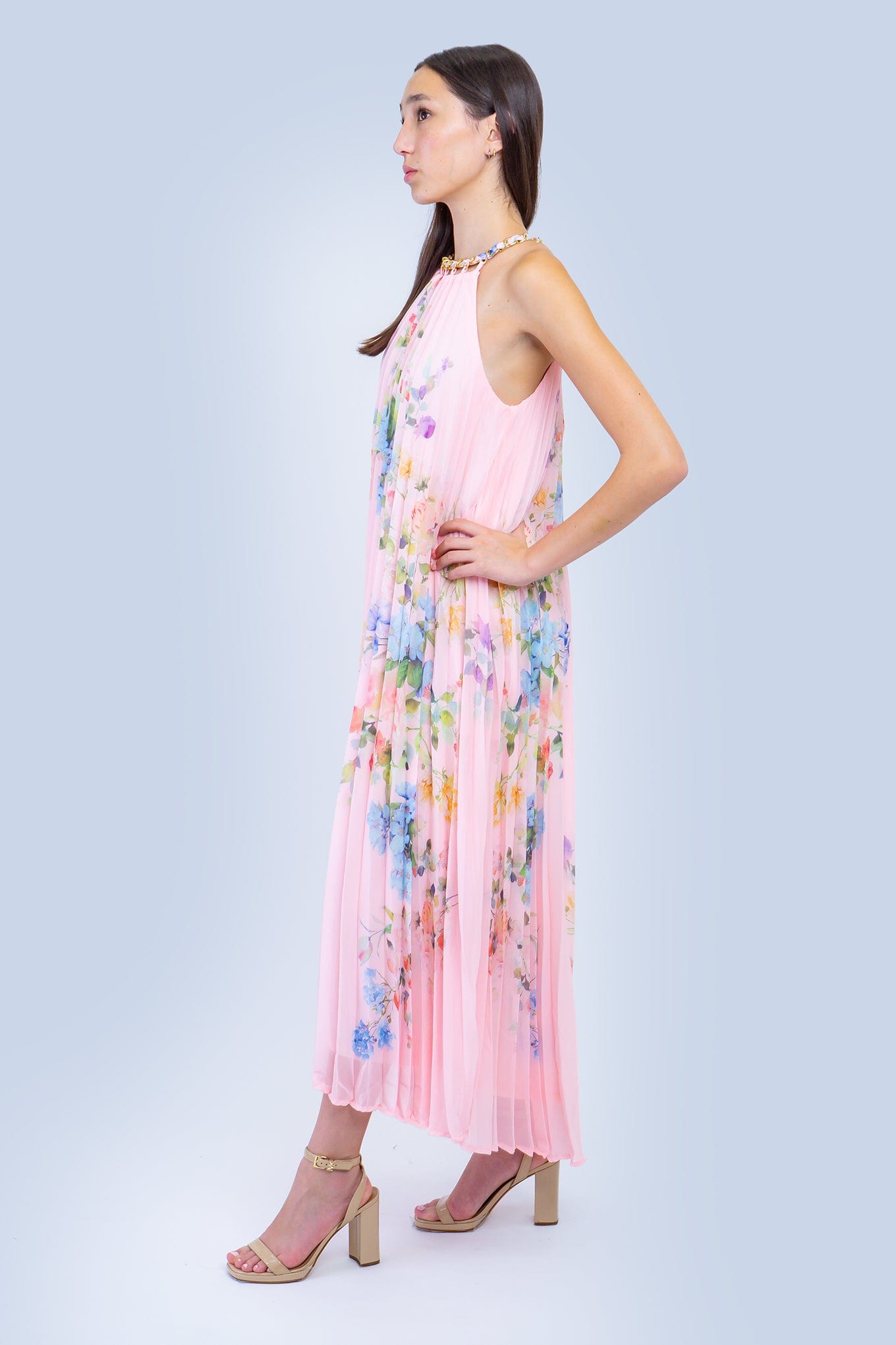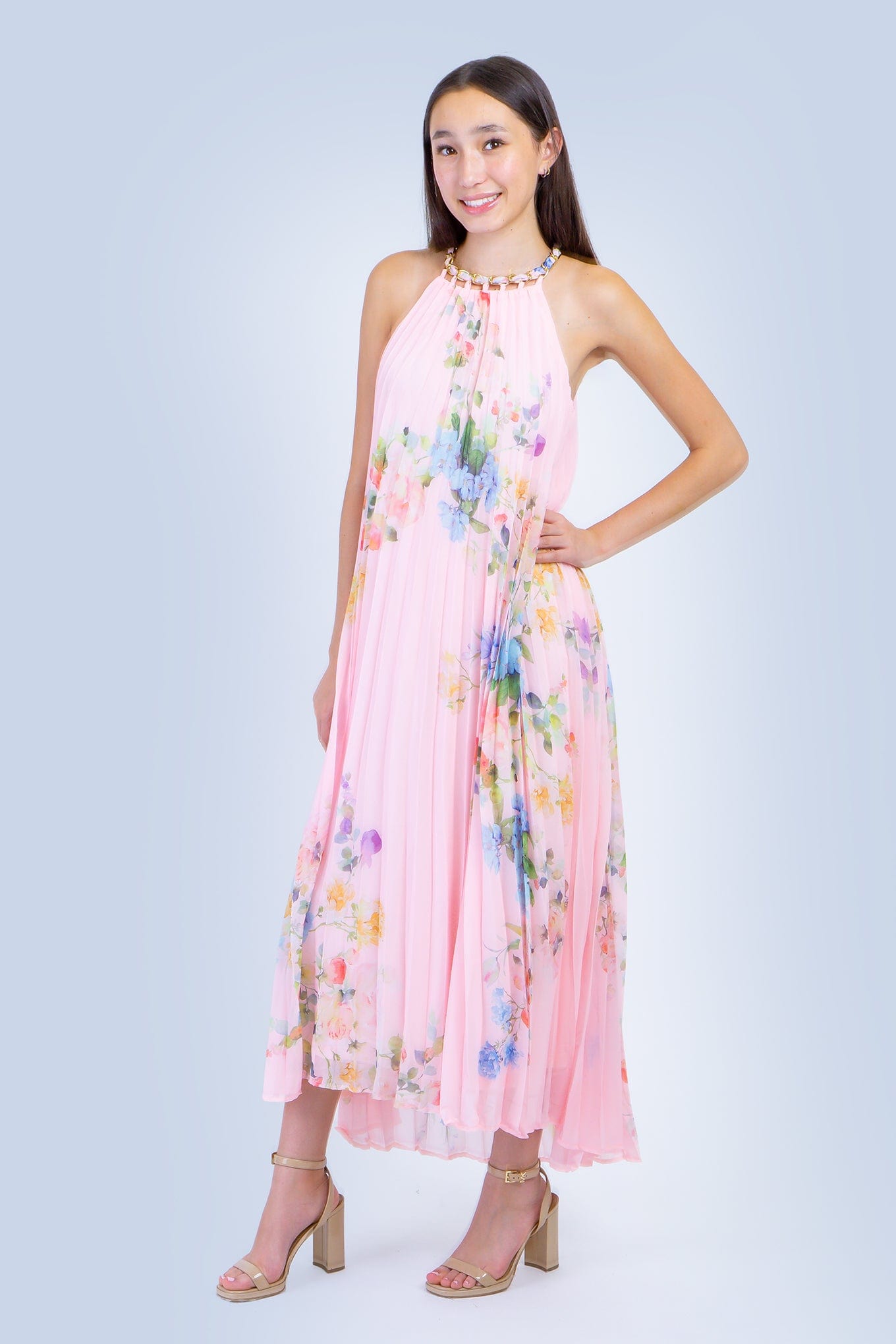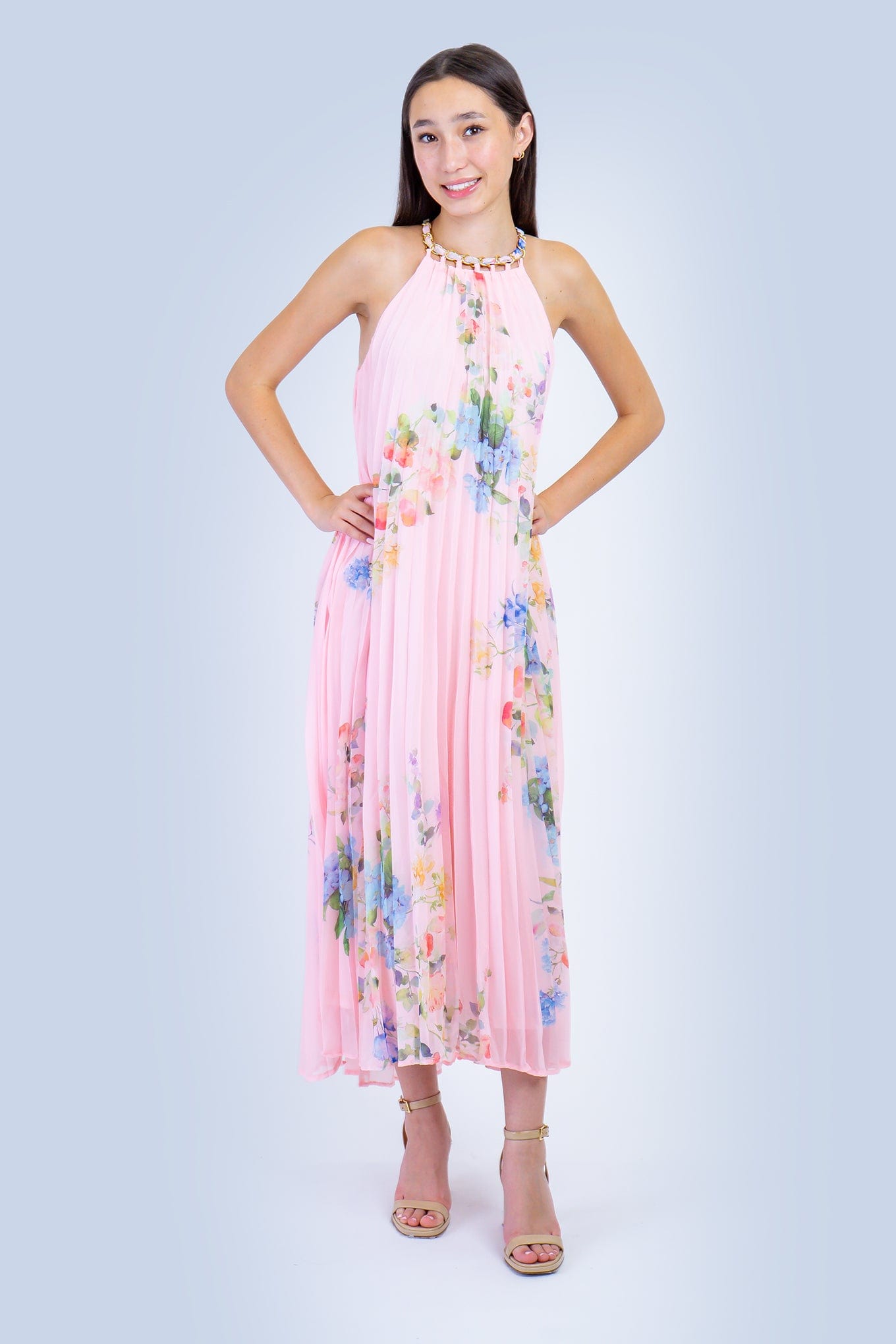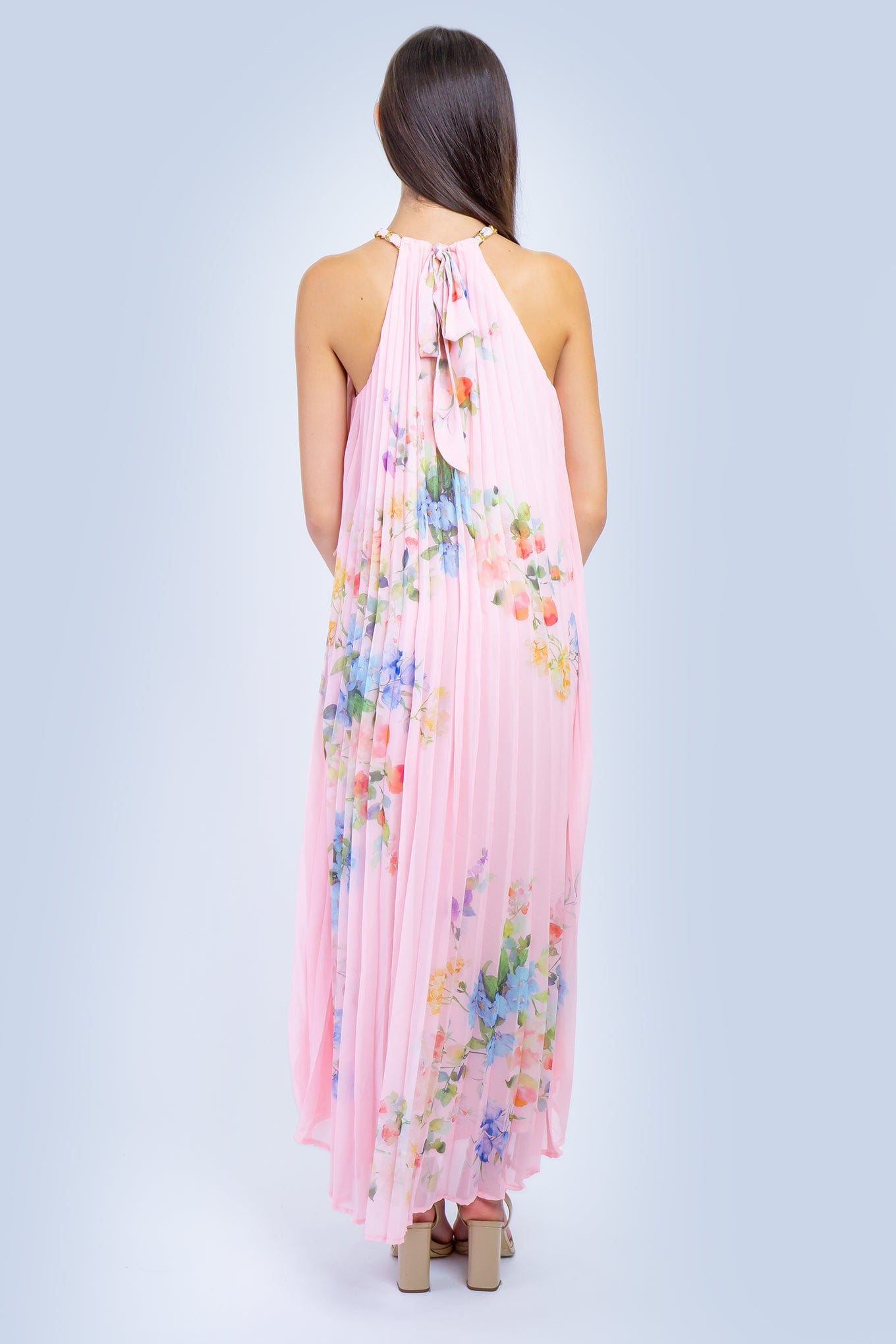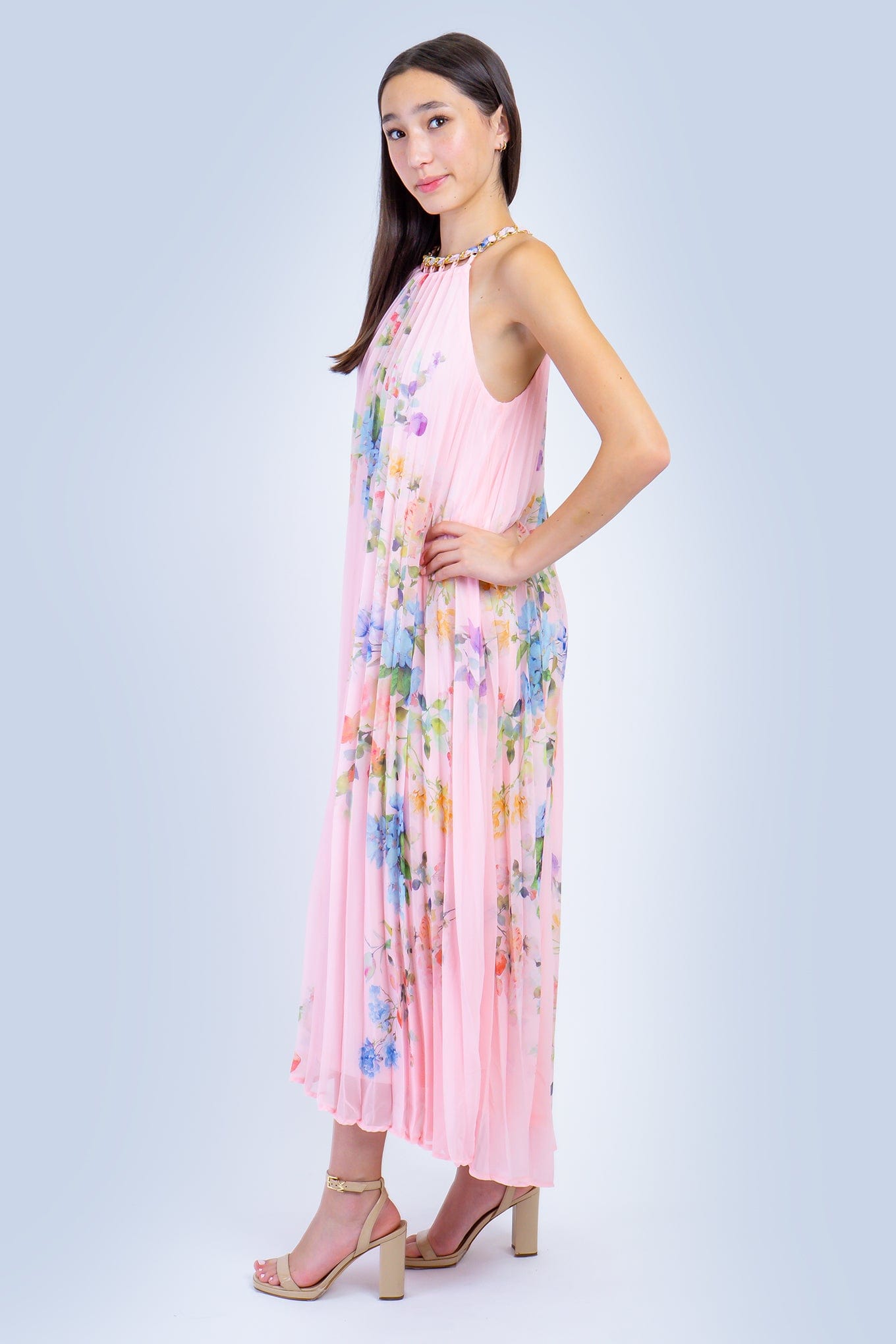 This pink floral dress features a sleeveless halter design with a delicate chain detail. Its relaxed fit and midi-length pleated skirt offer effortless elegance, while the matching chain belt allows you to define your waist for a refined silhouette.