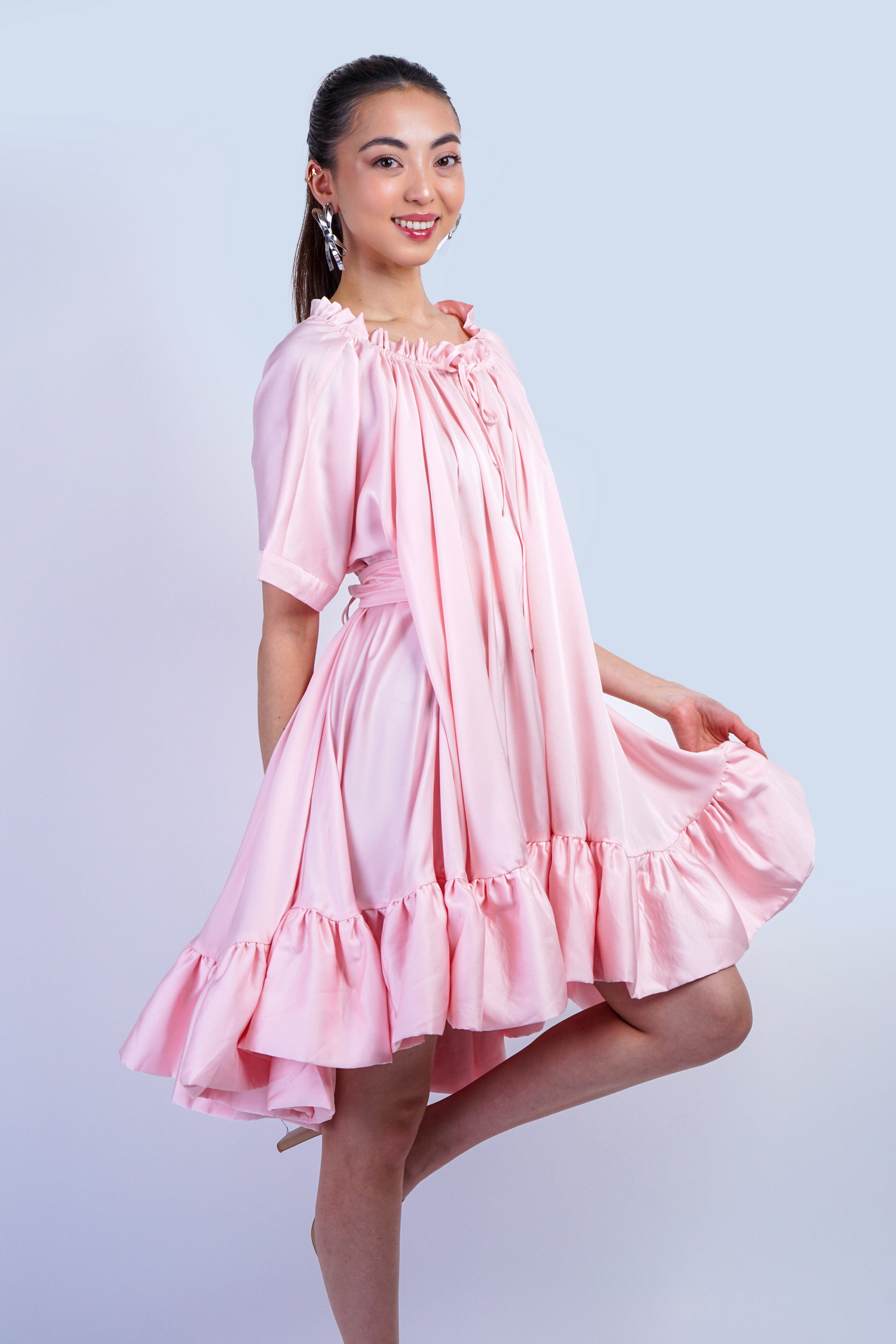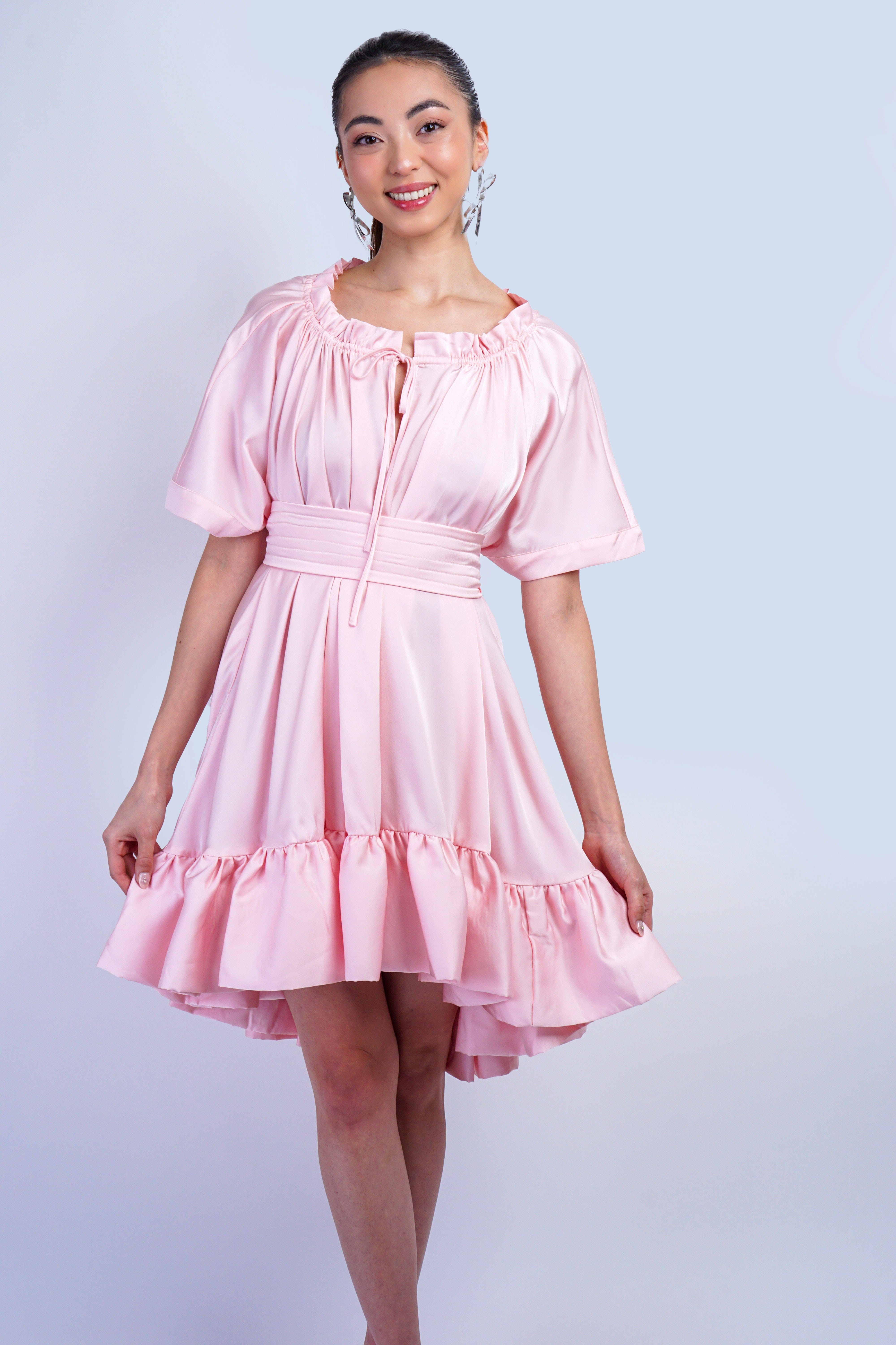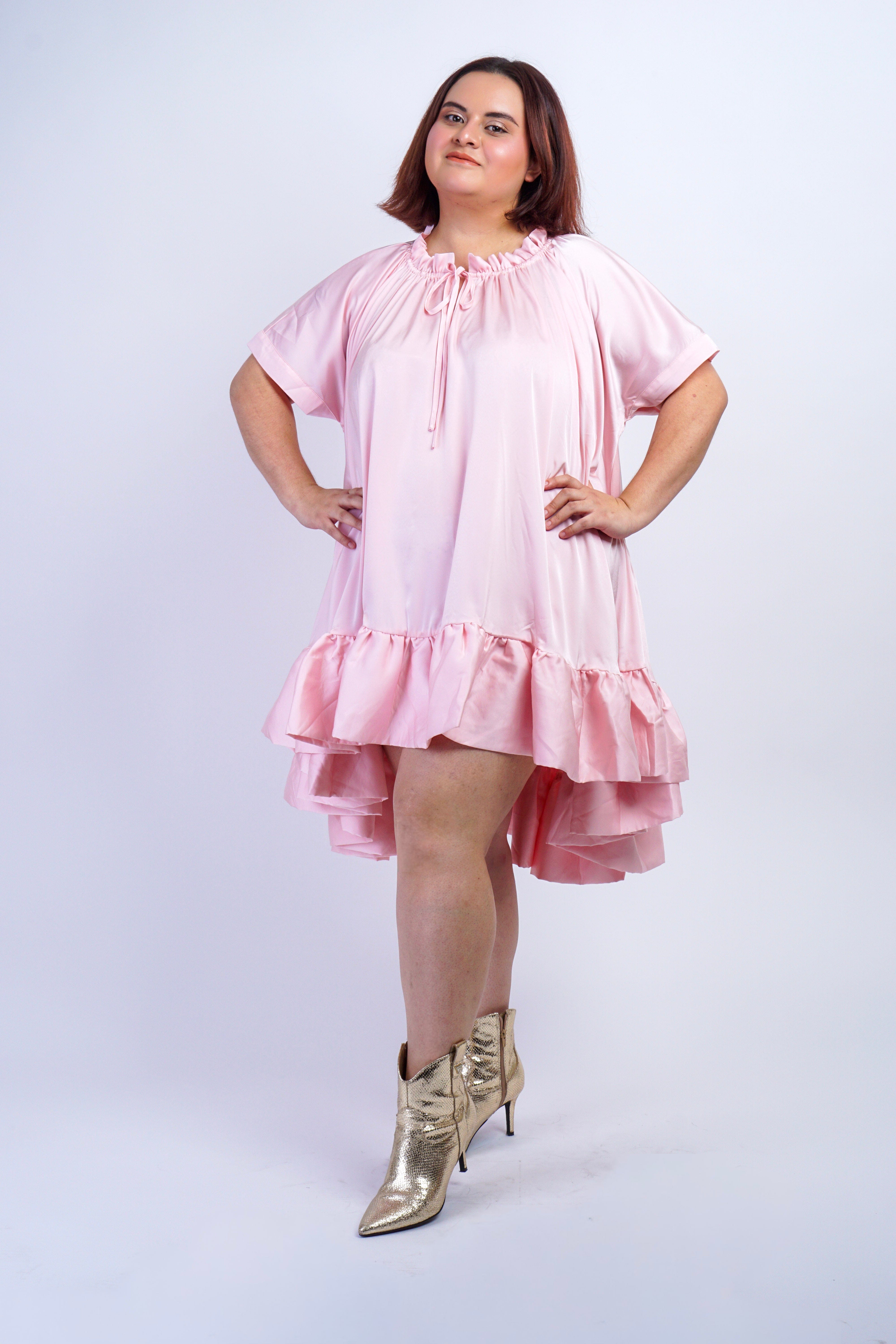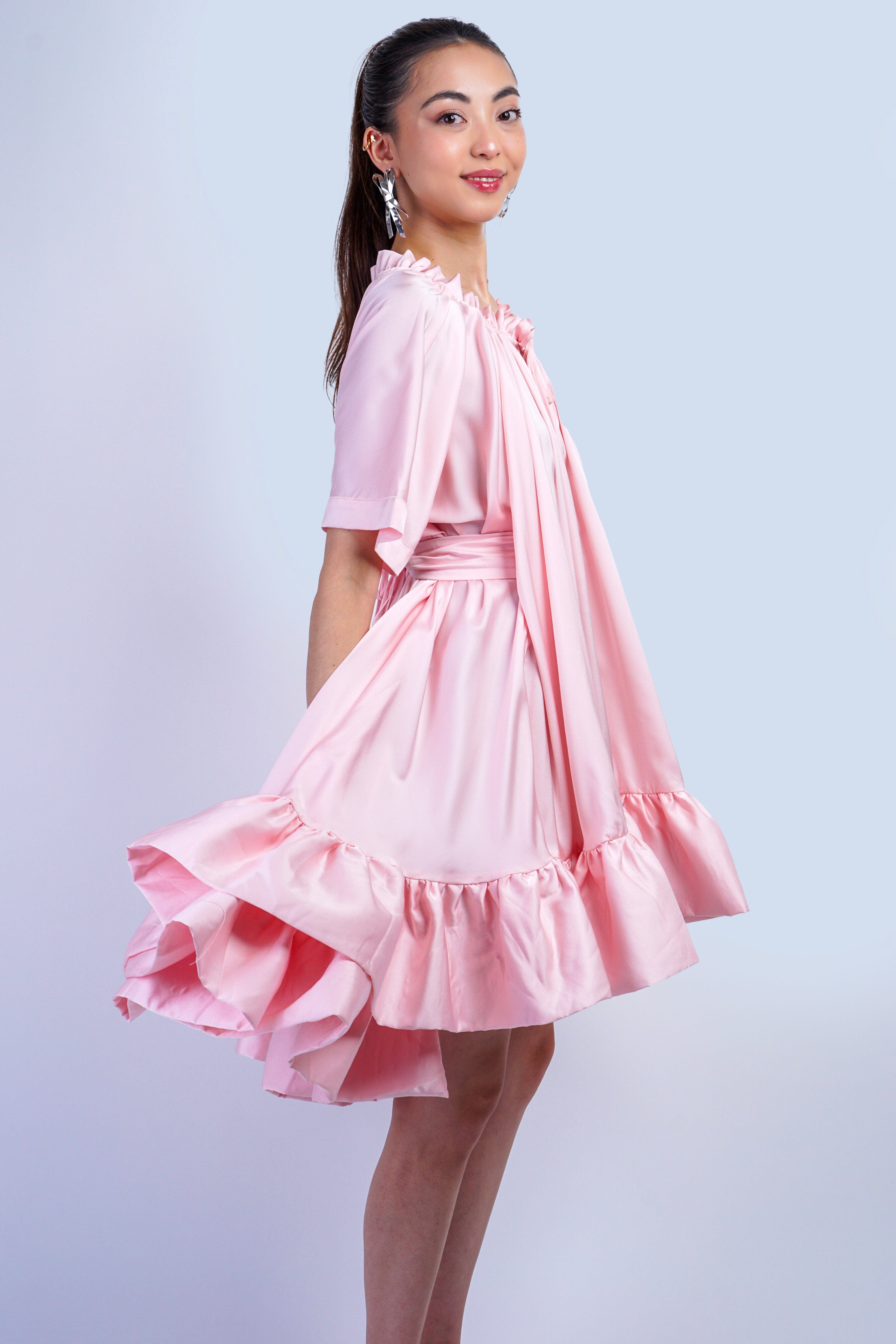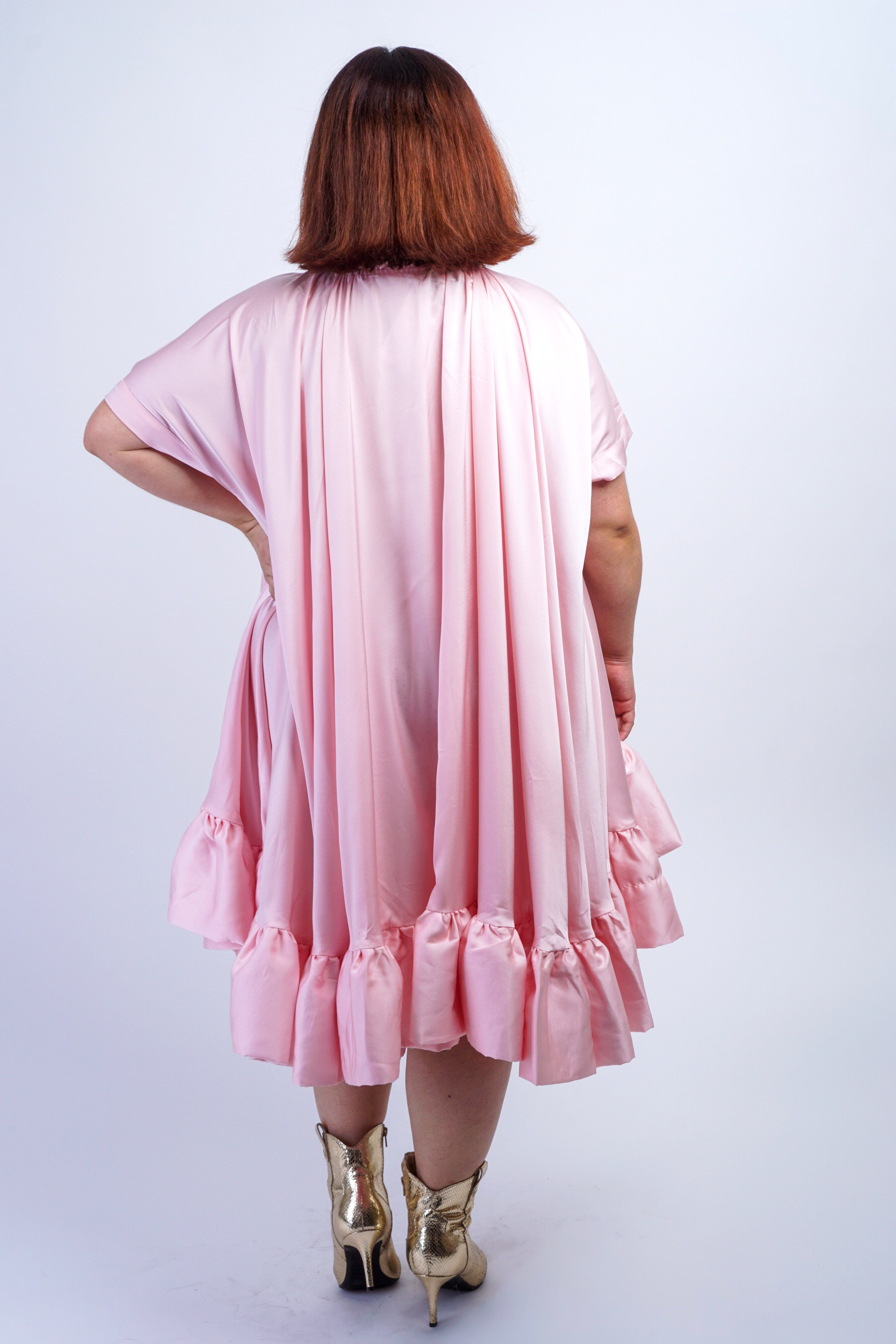 This Pink Ruffle Hem Shift Dress features structured pointy shoulders and voluminous mid-length sleeves, combining classic patterns with modern tailoring for a refined silhouette.