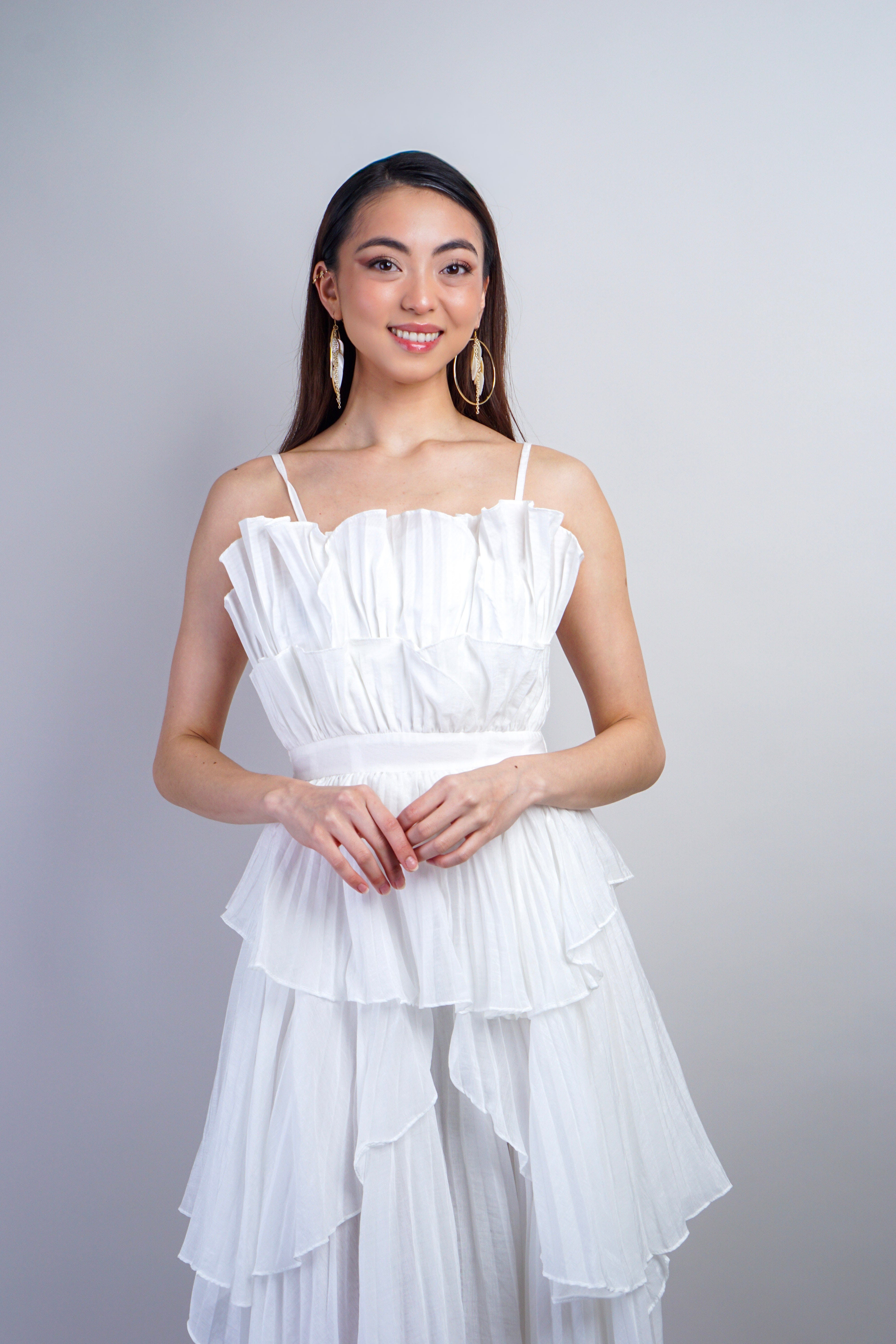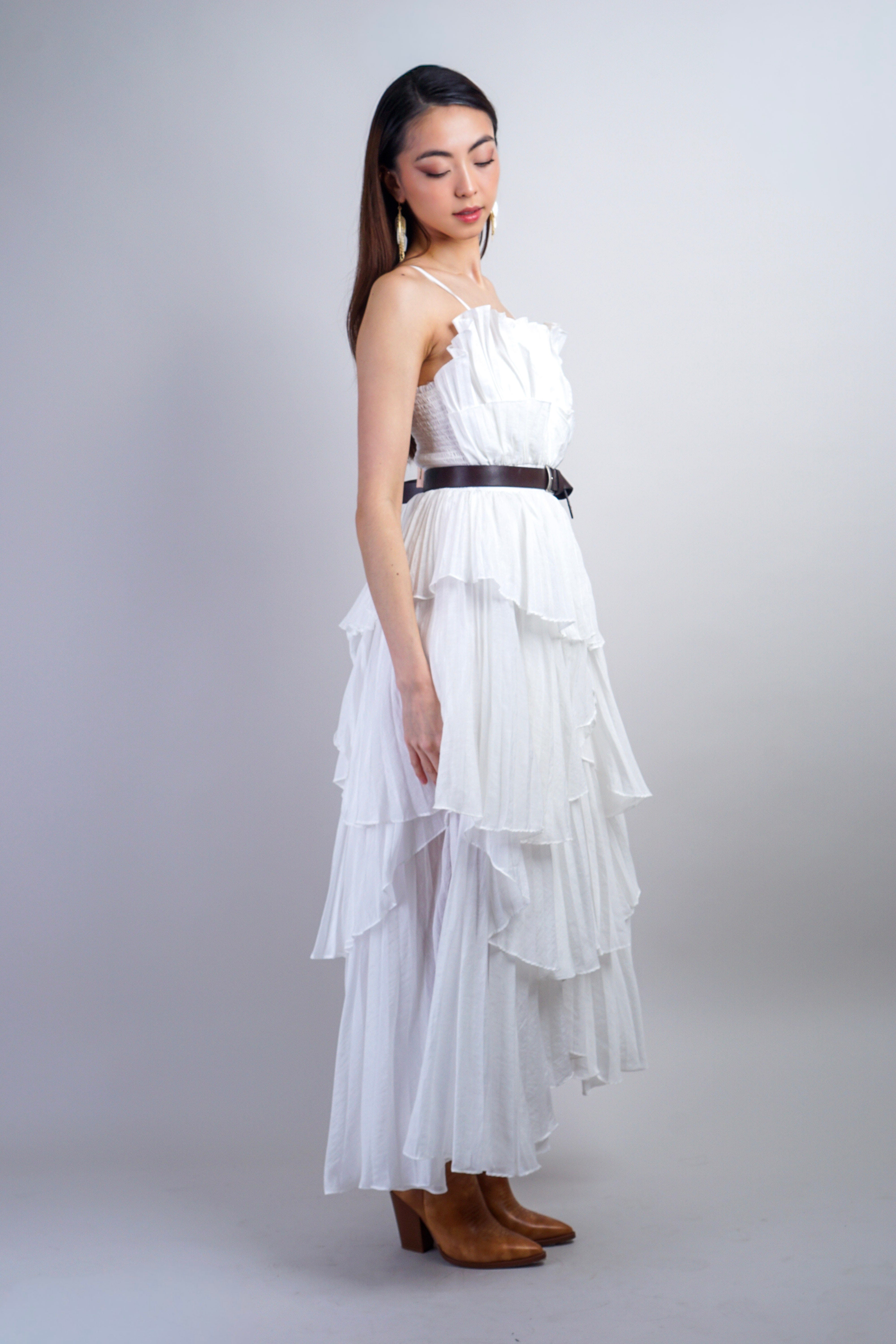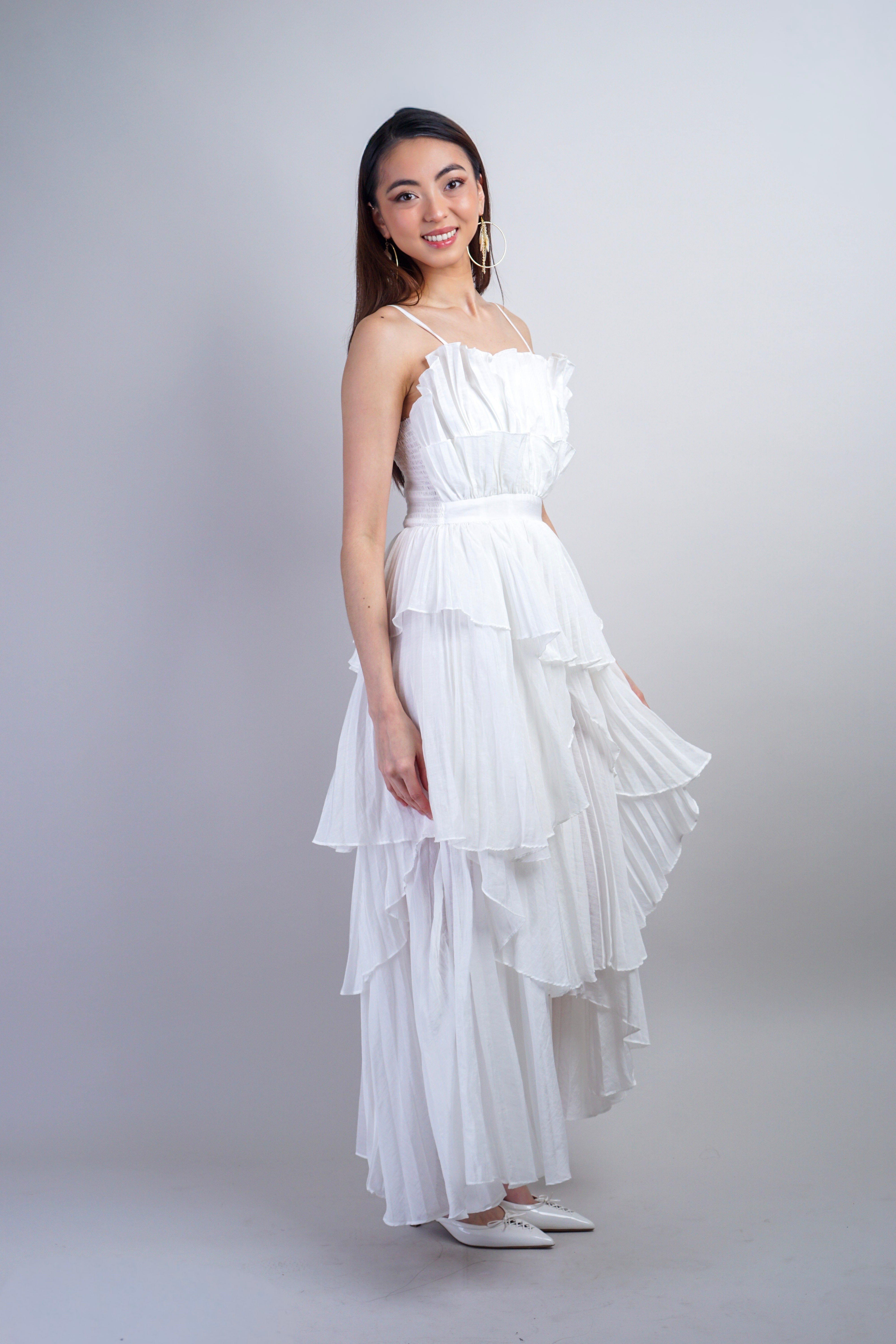 Elegant white maxi dress featuring delicate ruffle detailing and sleeveless design for effortless sophistication. The flowing silhouette drapes beautifully, making it perfect for special occasions, garden parties, or elevated everyday wear. Crafted with premium fabrics that move gracefully with you, this timeless piece transitions seamlessly from day to evening. A versatile wardrobe essential that pairs beautifully with minimal accessories or statement jewelry.