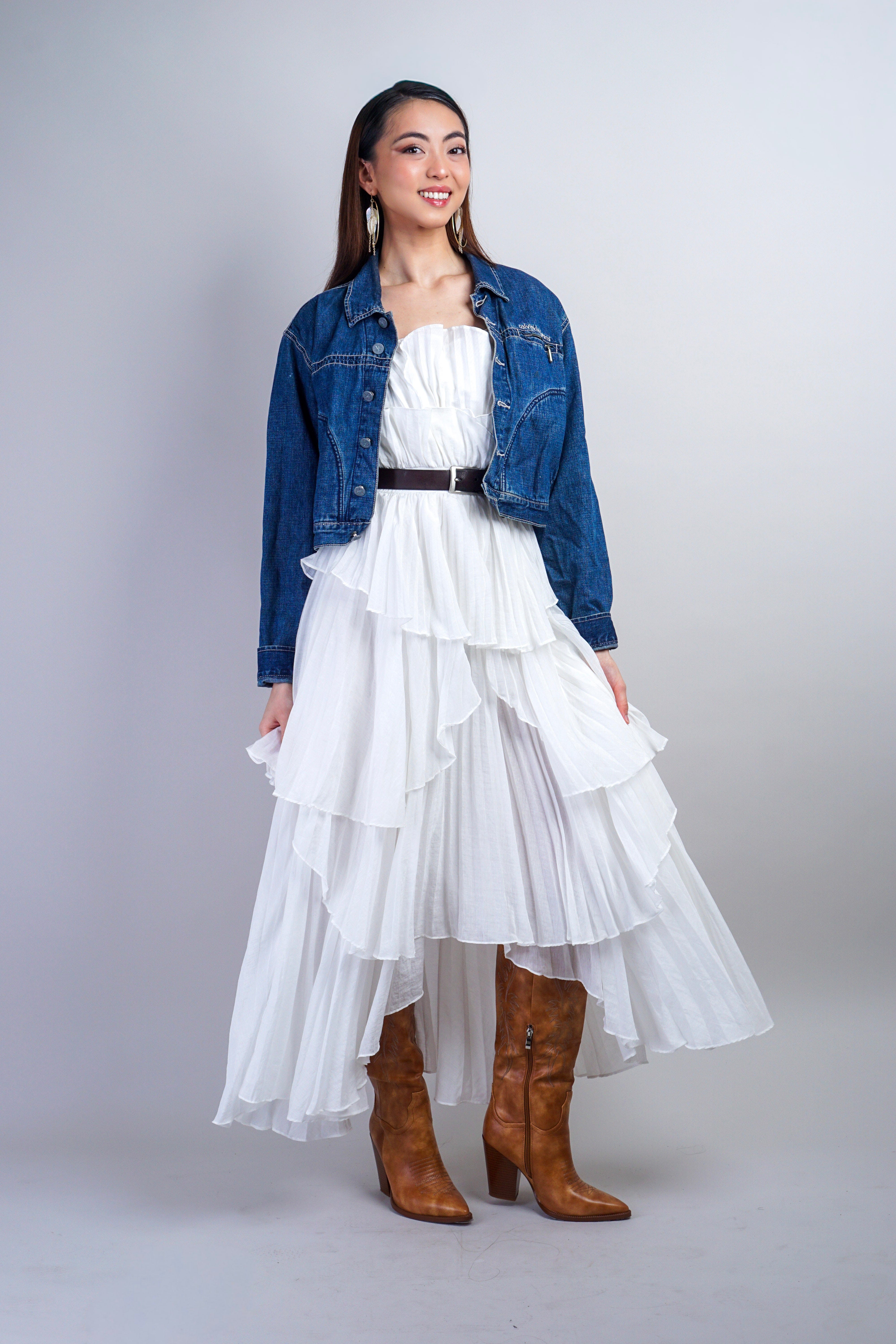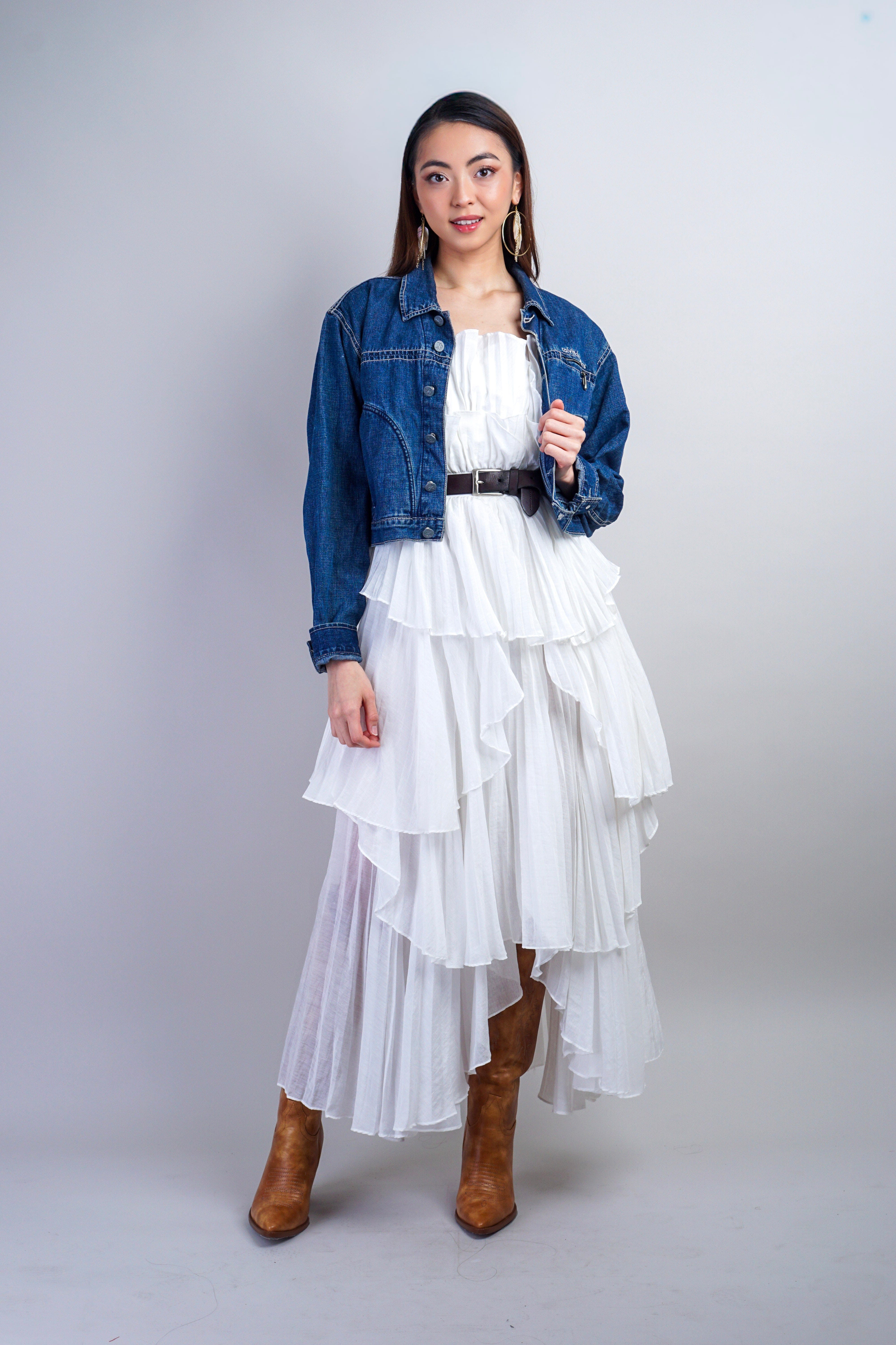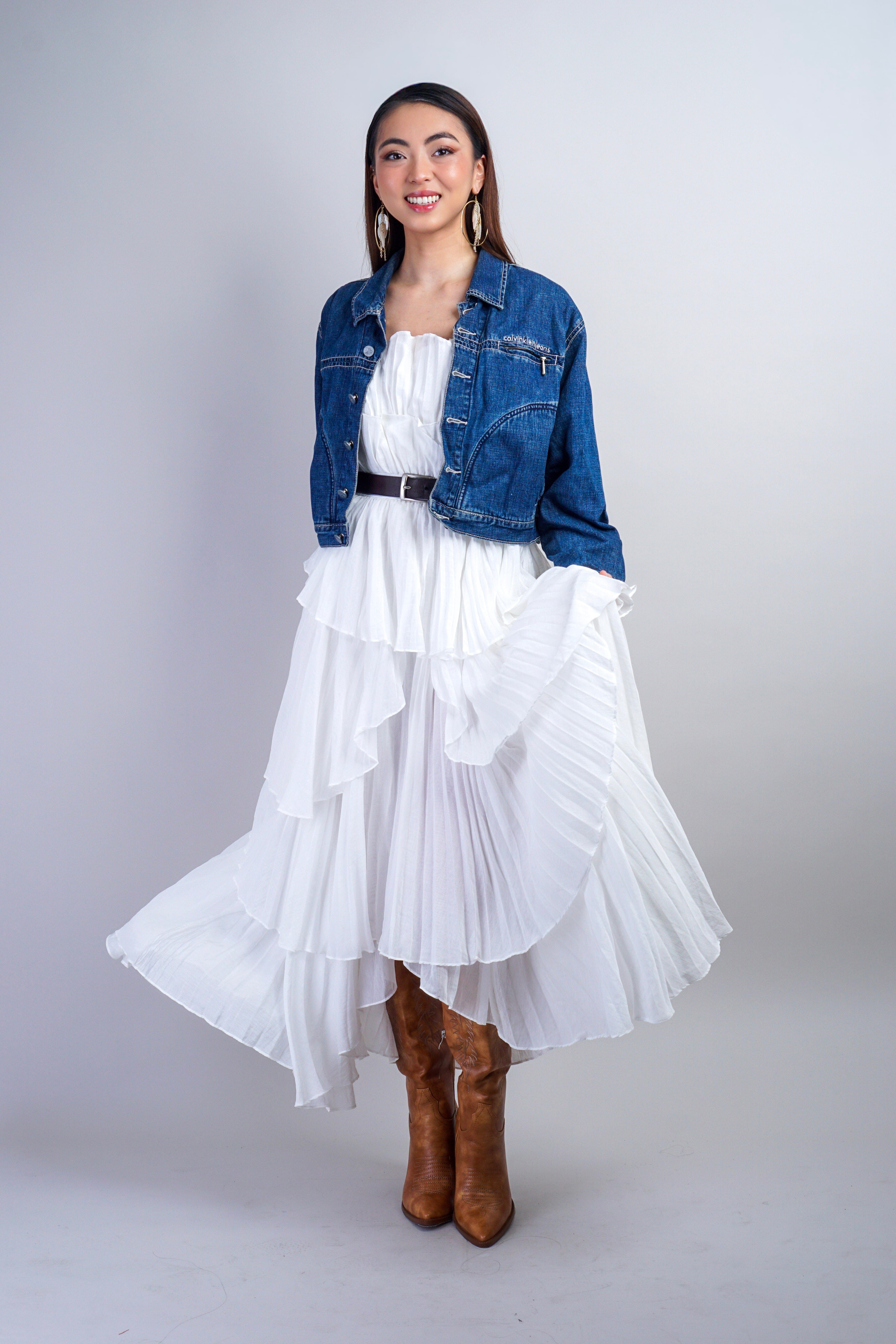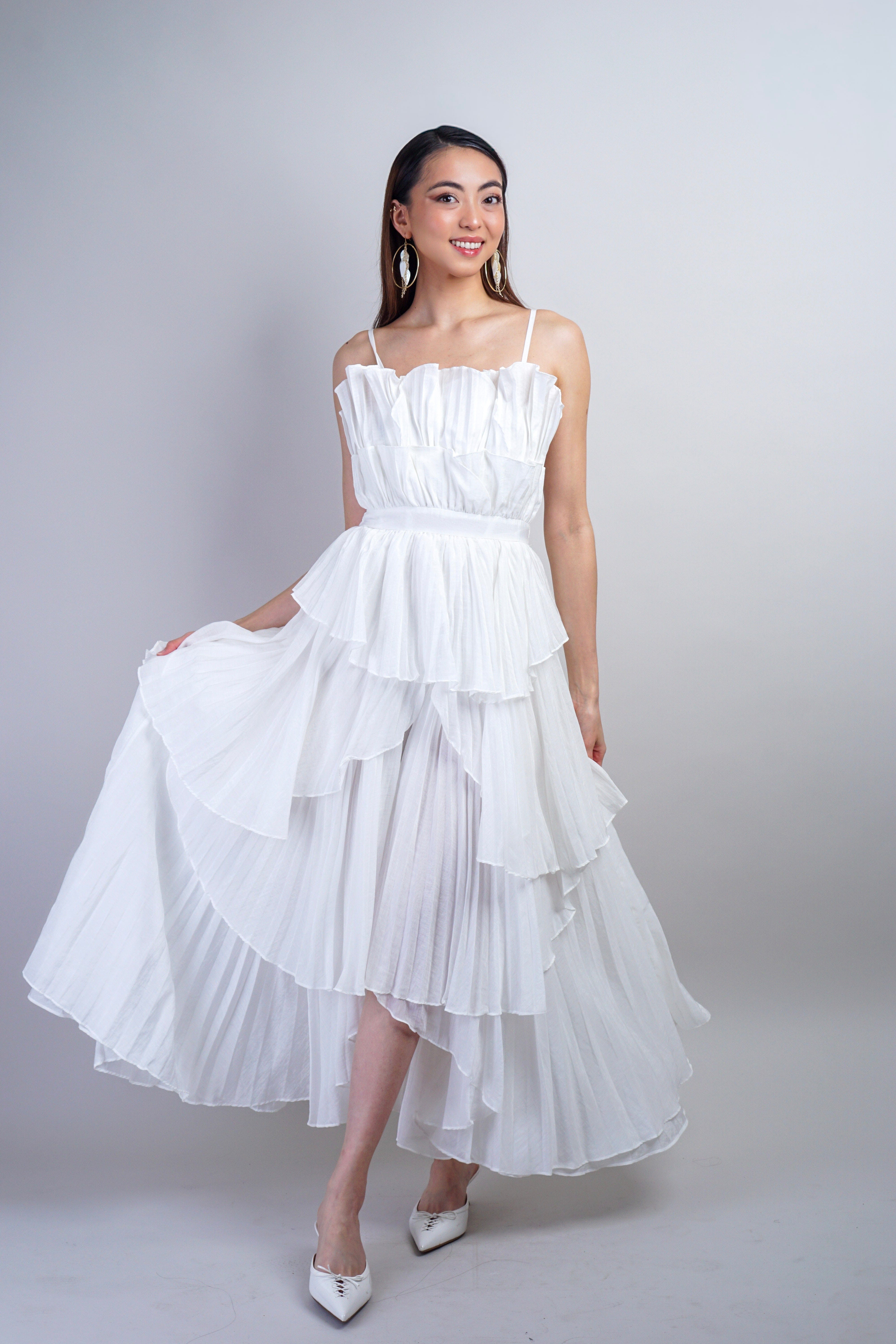 Elegant white maxi dress featuring delicate ruffle detailing and sleeveless design for effortless sophistication. The flowing silhouette drapes beautifully, making it perfect for special occasions, garden parties, or elevated everyday wear. Crafted with premium fabrics that move gracefully with you, this timeless piece transitions seamlessly from day to evening. A versatile wardrobe essential that pairs beautifully with minimal accessories or statement jewelry.